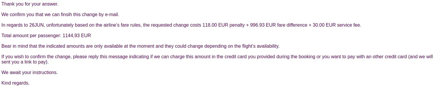 6 hours later, they sent me an email that I can confirm the payment via email, but I need to pay "1144.93 Euros based on the airline's fare rules (118.00 EUR penalty + 996.93 EUR fare difference + 30.00 EUR service fee))."