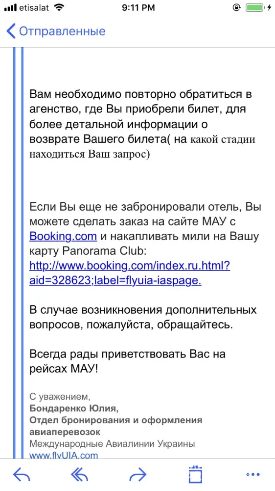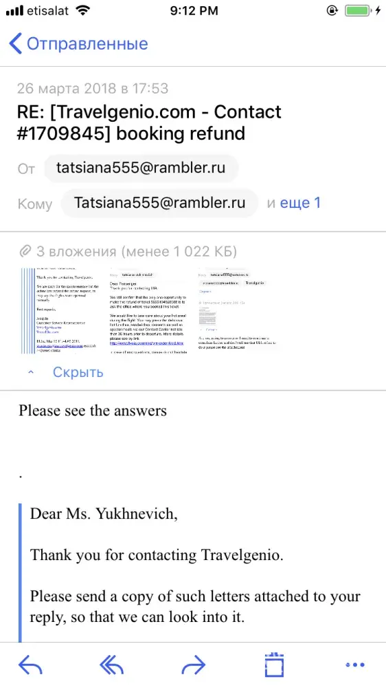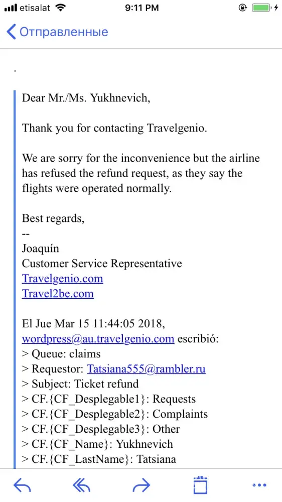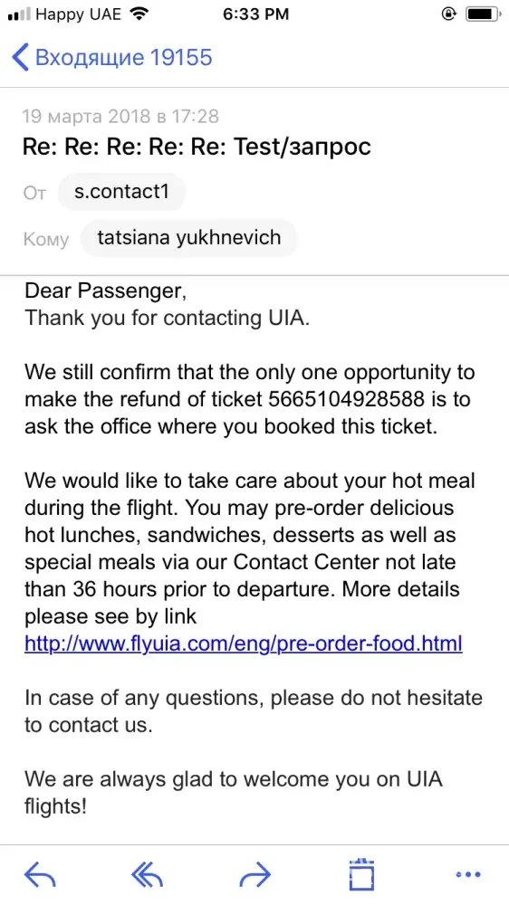 On the 8 of March I booked ticket Minsk-Dubai for UIA using TravelGenio. Flight was supposed to be on 11 of March but my visa was not ready in time and as per Operator of UIA advice I froze the ticket and bought new one and asked to refund it next day. Booking 9963025, e-ticket [protected], reference SP8RHS ([protected]). When I called TravelGenio I was confirmed that refund processed will be done during 30-45 days. Next day I asked UIA to reconfirm ticket status however nothing was done. When I checked TravelGenio they answered that UIA refused to refund. When I came back to UIA they reconfirmed that it should be refunded and ask TravelGenio to contact their department which works with agencies. After that TravelGenio just stopped to reply