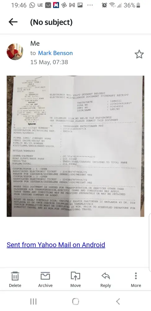 When I got to the airport Turkish airlines told me that my travel agency had given me the wrong information regarding the luggage allowance. In Mark Benson's email he stated that I was allowed 2 bags checked in luggage with a total of 23kgs each max. Turkish airlines told me that I was only allowed a maxiimum of 20kgs a case, totalling 40kgs. I was also 3 kgs overweight which I paid myself. I tried to phone Mark but he wasn't in the office and the person I spoke to was absolutely no help and just said they'll phone me back which they didn't. I had to pay the extra kgs. I emailed Mark and he said that I would be reembursed. He eventually said that I could have the amount off my next air ticket. In the last email he told me that he was only giving me £85 off my air ticket but wanted to charge me £599 for a ticket that is only £539 elsewhere. When I phoned him about this he was annoyed and told me to go to another agency if I didn't like it. It was my problem with Turkish Air and not his.