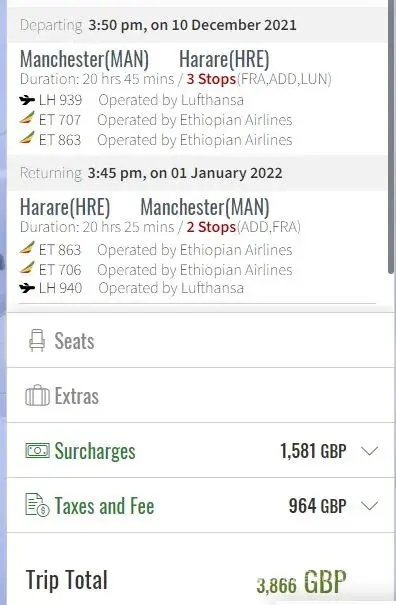Bought 5 tickets to travel to Zimbabwe in Dec 2020 (£2584) couldn't travel because of Travel Restrictions. Called Travel House to change tickets to March, paid additional £404 fir this change and still couldn't travel. Have now decided to travel in Dec and am being asked to pay £1890 for Dec tickets bringing total paid to £4878. Going on Ethiopian Airlines directly the same Dec tickets are costing £3866 today 15.10.2021