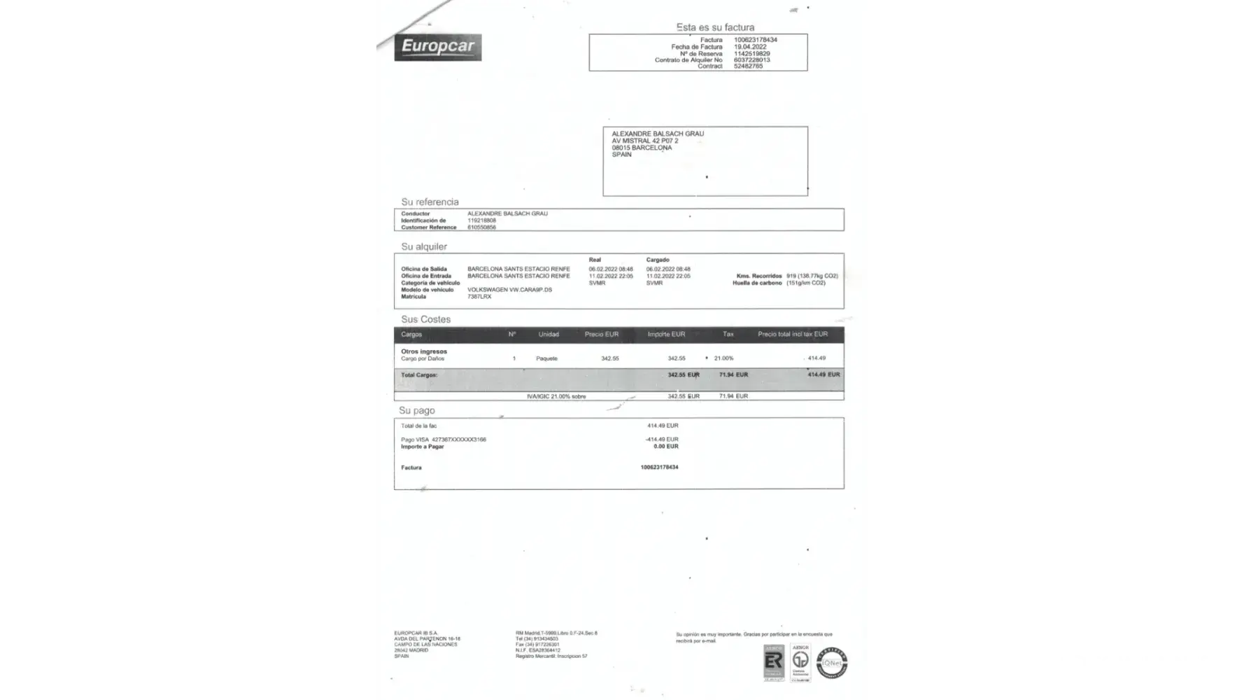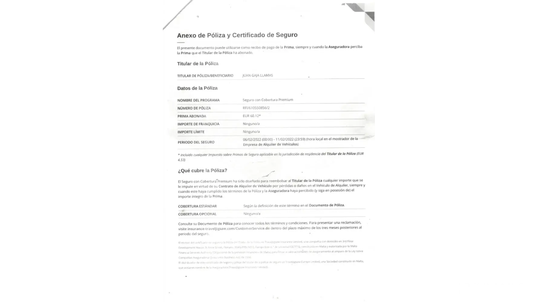 Being signed our assurance at EUROPCAR BARCELONA in YOUR COMPANY, RESERVATION: [protected] (Document-1), with coverage (indicated on the assurance certficate) "this assurance PREMIUM will reemborse anmy import fopr loosings and damages in your hired car INCLUDING ANY FRANCHISE YOU MUST SETTLE" (Documents-2/3).