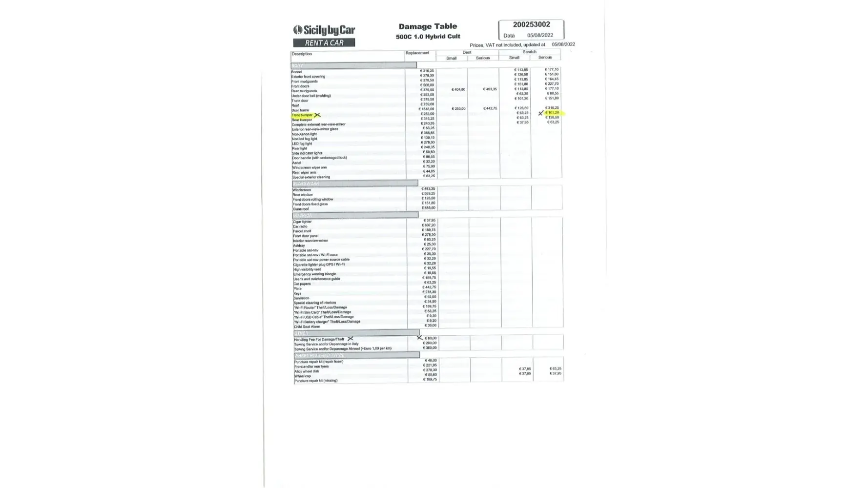 Amount Paid to the Rental Car Company to repair the damaged bumper: 1.232,25 Euros
