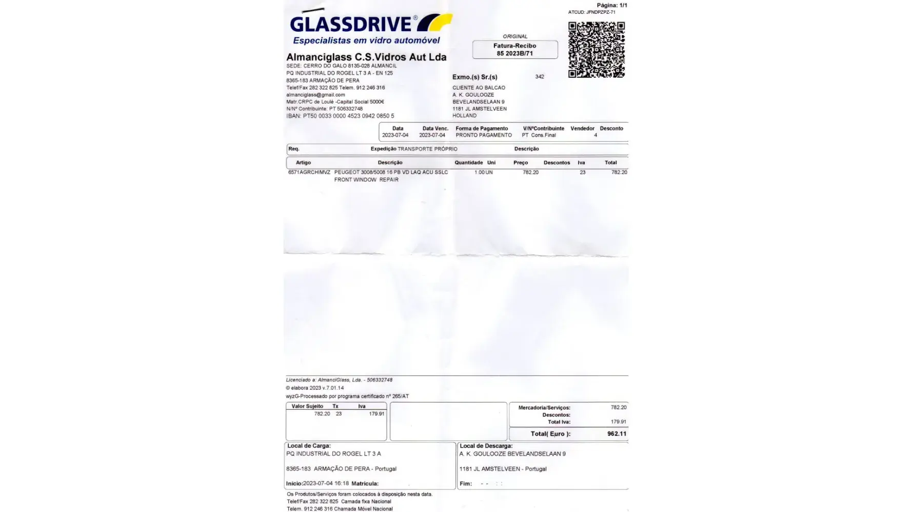 The damage of the frontwindow is not our fault; it happened during the night while street parking in Porto. It was 962,11 euro's (of course we have recipt).