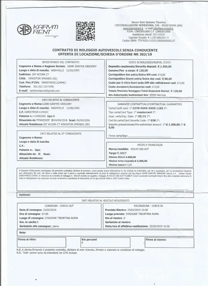 I rented a vehicle from Karym Rental from 22/02/2019 to 25/02/2019 Business VAT [protected] acct#1108905 Confimation #1852618. I turned the vehicle in and showed the employees the tire/wheel that I had scraped against a curb. I told them that I have purchased coverage from RentalCover.com and they waived me on and said don't worry about it. I was in error by not staying and getting a final receipt. I assumed that they would email me a receipt or get in touch with me if there was a problem. I received my credit car statement and they had charged me 1300 euros or $1477.84 on my credit card. Also this charge was placed on 26/02/2019, there was not enough time to get estimate and repairs by the day after I returned the vehicle. How could they know what the charges would be? I immediately tried to get this settled and could not get in touch with Karym. The person who answered the phone (Gabriel) said that they would credit it back that it was just an oversight but when I asked if I could talk to the office he said they didn't have a phone # but I could email Decno. service@email. it. That email was never answered. I emailed Rentalcars.com and Sammy R. said he would get in touch with Karym and get it worked out. April 4th was my last communication with them. I put in a claim to RentalCover.com policy#COLVY79VP87A Ref# BAT2-JAP1-INS because I then assumed it could have been the tire/wheel scrape. RentalCover said I needed a copy of the estimate and show proof of repair. That was what Sammy R was going to get and now nice Ms. Melissa B. from RentalCover.com is trying to help me but nothing is happening. I have a photo of the damage to the tire/wheel and that is all of the damage to the vehicle if anything else is added that is fraudulent. I also had the car on full when I dropped it off. I cannot believe a scrape on a tire/wheel cover would cost so much. But either way I had bought the coverage and that should be covered. This has been a very frustrating and a painful struggle for my nerves. I believe they are trying to see if I will give up and not pursue this. What was a wonderful trip to Italy has become a real nightmare. I did not authorize or have any notification of this money being charged to my credit card. This is illegal. I have been cooperative and patient. Please help me with this!