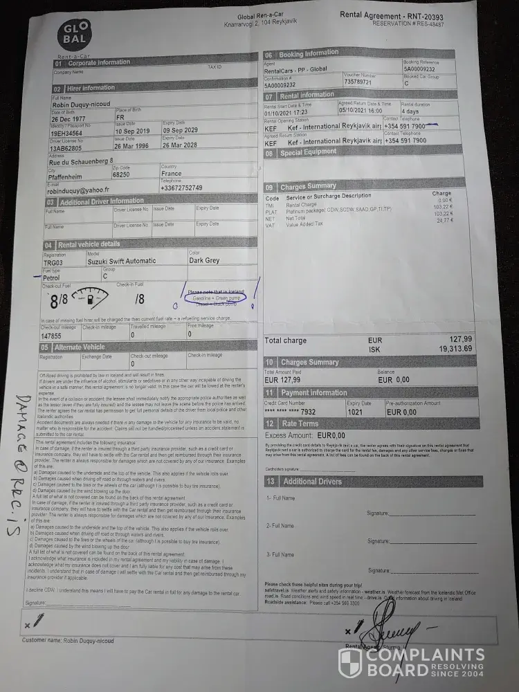 I paid for the "complete protection" when booking the car on internet, specific booking number for Global Rent A car : [protected].
