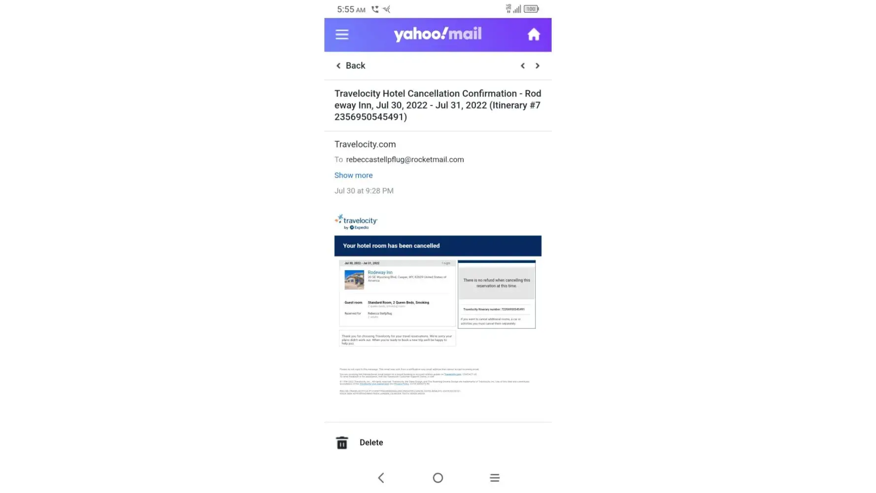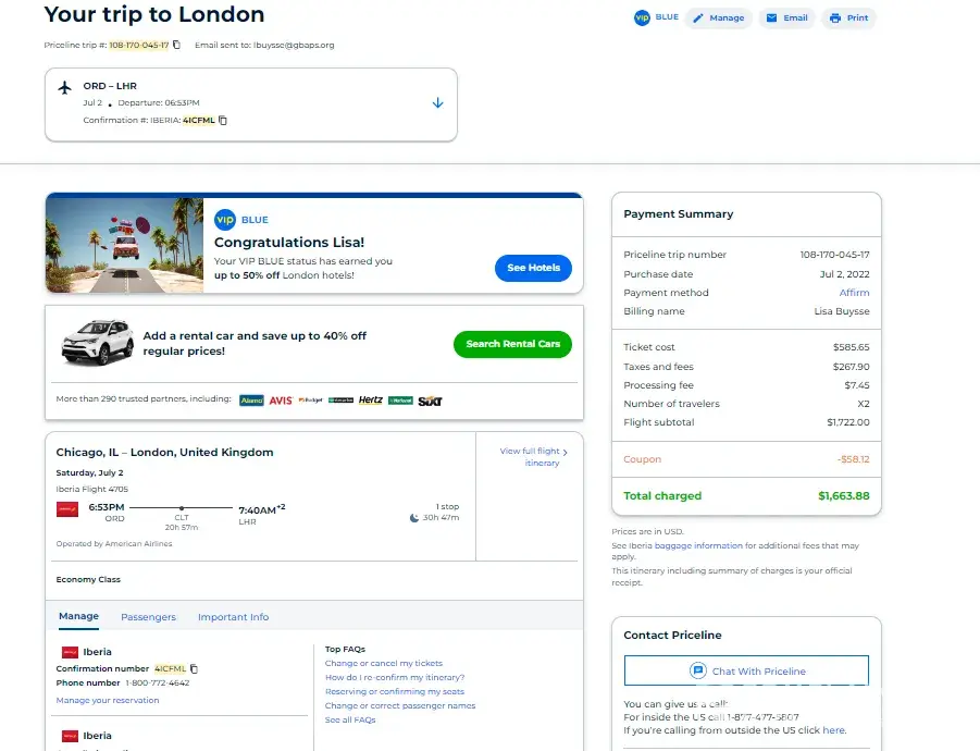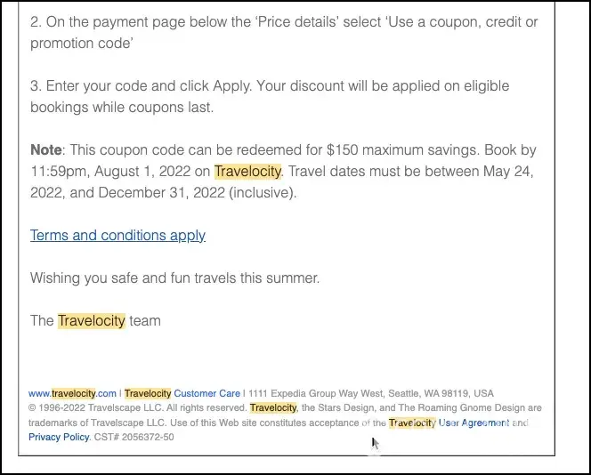 In my browser, I saw a message reading "Thank you! Your trip is booked.l Travelocity itinerary number [protected]. You'll receive a confirmation email shortly at [protected]@gmail.com."