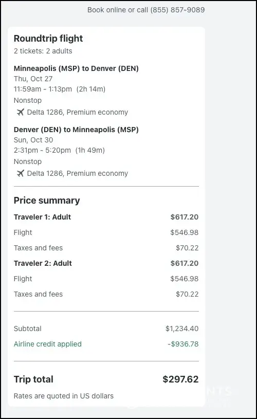 This evening, I attempted to use the credit to book a round-trip trip for two from Minneapolis to Denver. After several tries, I submitted the reservation request, including giving my credit card information to cover the extra cost of $297.62.