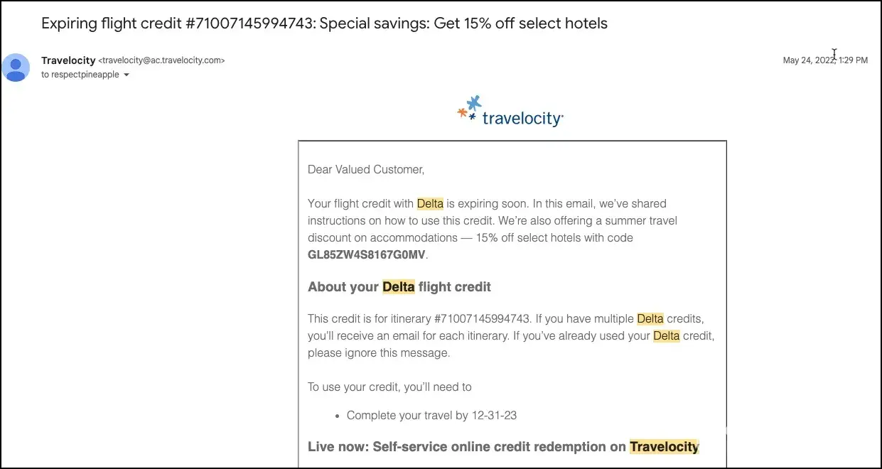 Travelocity has emailed me reminding me to use an expiring flight credit worth $936.78.