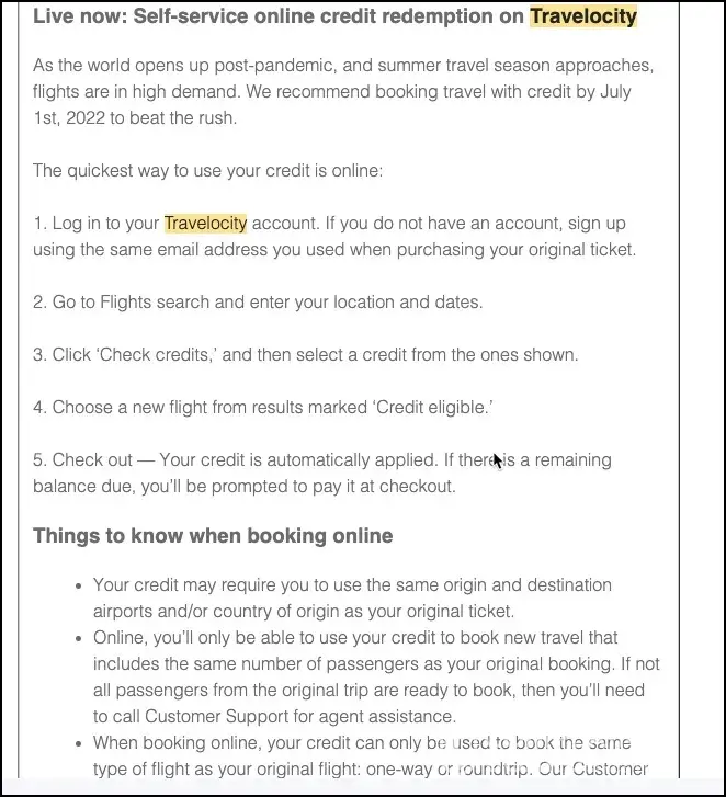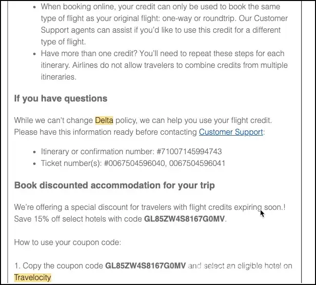 After 1 hour and 45 minutes, I was told that my tickets had "expired" and that is why I was unable to book flights using the credit. This makes little sense, as the repeated emails from Travelocity have said I have until 12/31/23 to use the credit. The story was then that I need to contact the airline (Delta) to request new tickets using the credit.