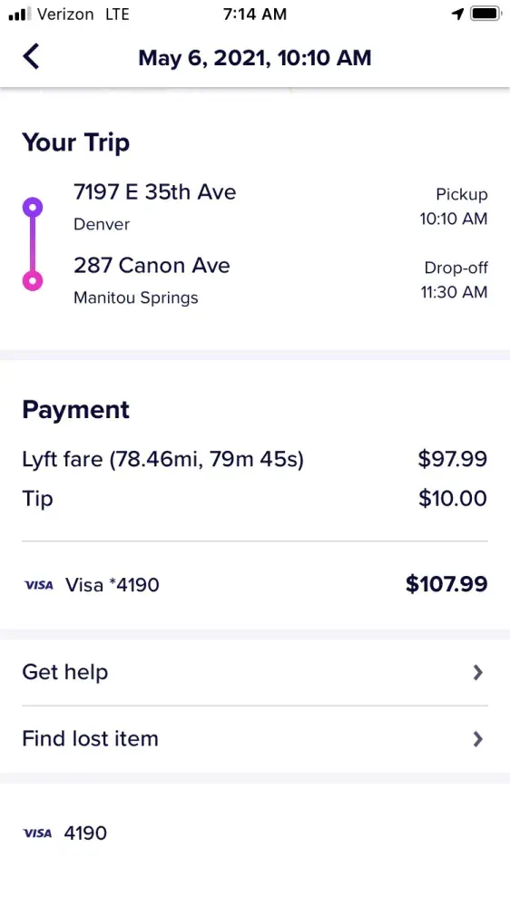 We rented a car on 5/6/21, itinerary number [protected] for a quoted price of $165.75. When we arrived at the rental counter, the agent told us that Travelocity had rented us a car that didn't exist. Our only options at that point were to either rent a different car for more than twice the price, or take Lyft from Denver to Colorado Springs and back. Both options were significantly more expensive than the offer we accepted from Travelocity. The total for all Lyft rides was $250.62, a difference of $84.87. In addition, we opted not to make certain excursions while on the trip to avoid additional costs, and so missed out.