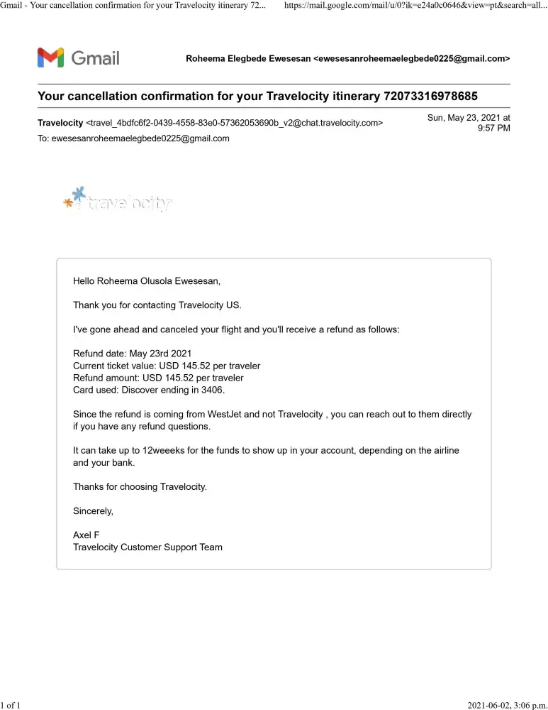 Travelocity Customer Support Team), and insisting that an email confirmation of cancellation be sent, which was eventually done. The email specifically states that refund would be credited to the account from which payment was authorized and that I should follow up with the airline. I have called the airline (Westjet) but to my surprise, I was told that I have to follow up with the travel agency that I booked with that they were sorry the travel agency should have explained in details to me. What they should have explained is what I still do not know. All attempt to get an update on refund has been unsuccessful and records show that I do not have any upcoming travel.
