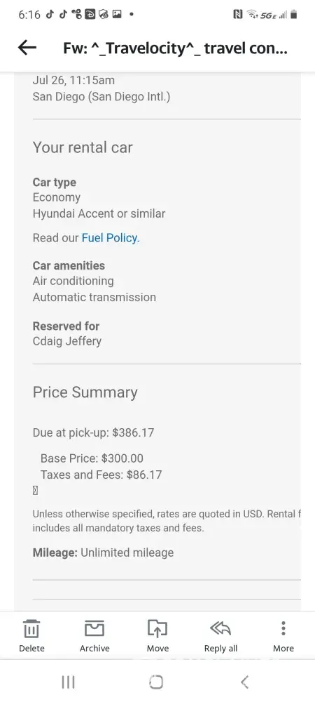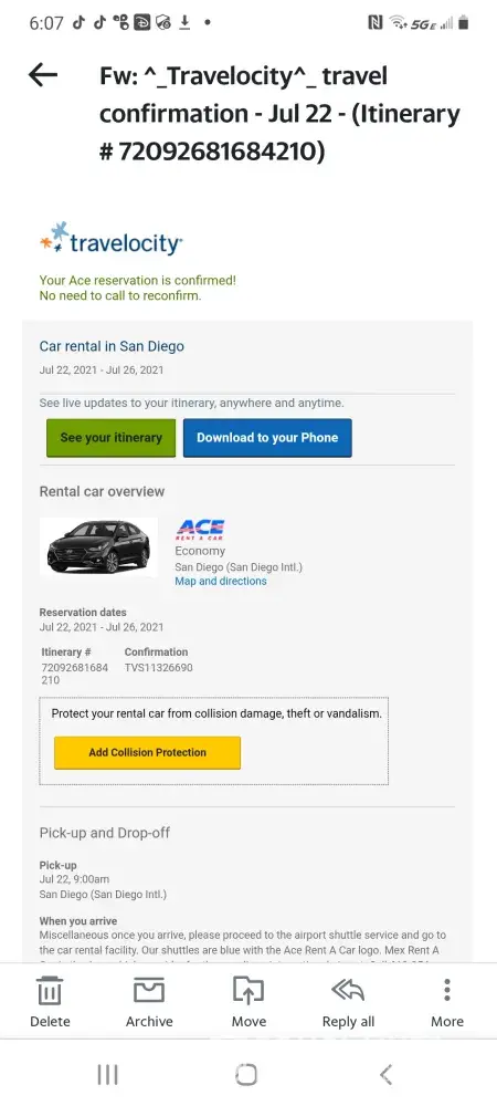 On May 3, 2021, I used Travelocity to reserve a rental car. While searching the site, I was led to Ace Car Rental. I reserved a car during a trip to San Diego California. When my family arrived and was in route to the Ace Car Rental office the van driver stated the they had overbooked reservations and they did not have any cars left for rental. I didn't understand how this could happen, I reserved early and it was just 10:00 am. I don't believe that they could have rented all if the cars so early. I had to frantically seek other car rental services and fortunately I was able to get a rental. The Ace Car rental reservation quoted a rate that would have cost $386, however, I ended up paying over $800 for a car. I believe that Travelocity should definitely think about dropping Ace Rental Car from your site. Thank you, My name is Craig Jeffery [protected])