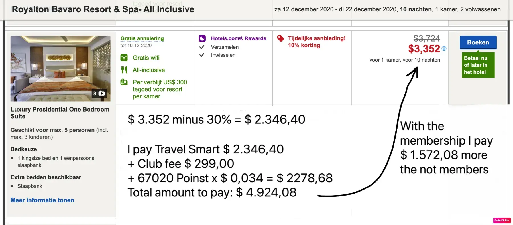 If I book the Presidential one bedroom suite at the Royalton Bavaro resort for 10 nights starting december the 12th 2020 I pay Travel Smart US$ 4.924, 08
