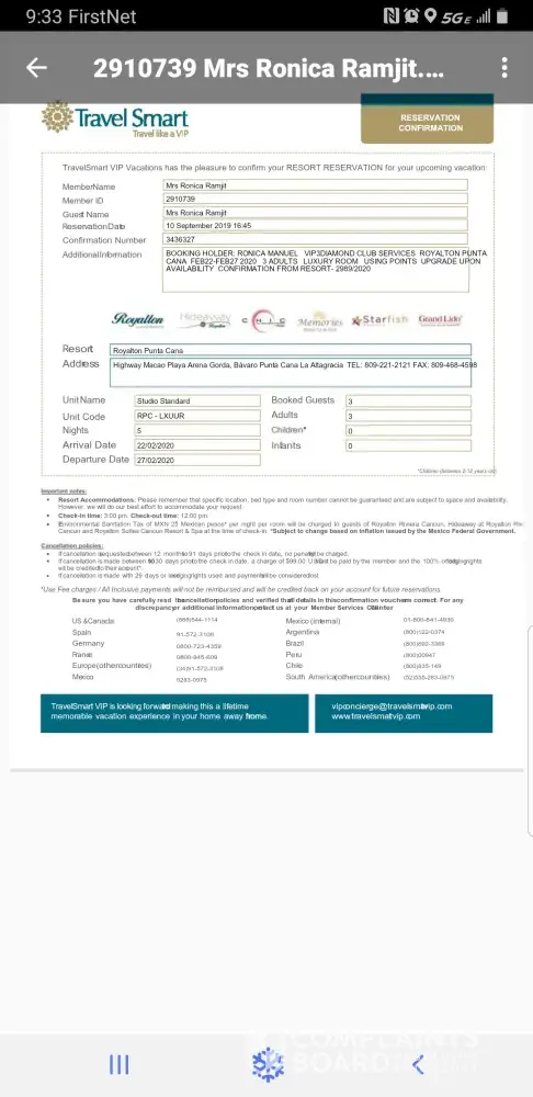 I booked a reservation in sept 2019 for an trip in feb 2020 ..which was confirmed, for 3 adults and 5 night ..paid with my credit card and got my confirmation reciept.. I get a call weeks b4 my trip telling me they made and error saying that my reservation was booked for 2 adults and 4 nights which was untrue because I have a receipt that clearly states what i booked..the reservation dept is now requested 900$+ or they will cancel my reservation.. not only that when I reached out to the resort itself they quoted me a price way cheaper than what travel smart quoted me ..why is that ? This very unprofessional and I didn't sign up for this kind of experience..this will deter me from ever recommending this company to any if my friends and family ..very disappointed ..please help alleviate this crisis