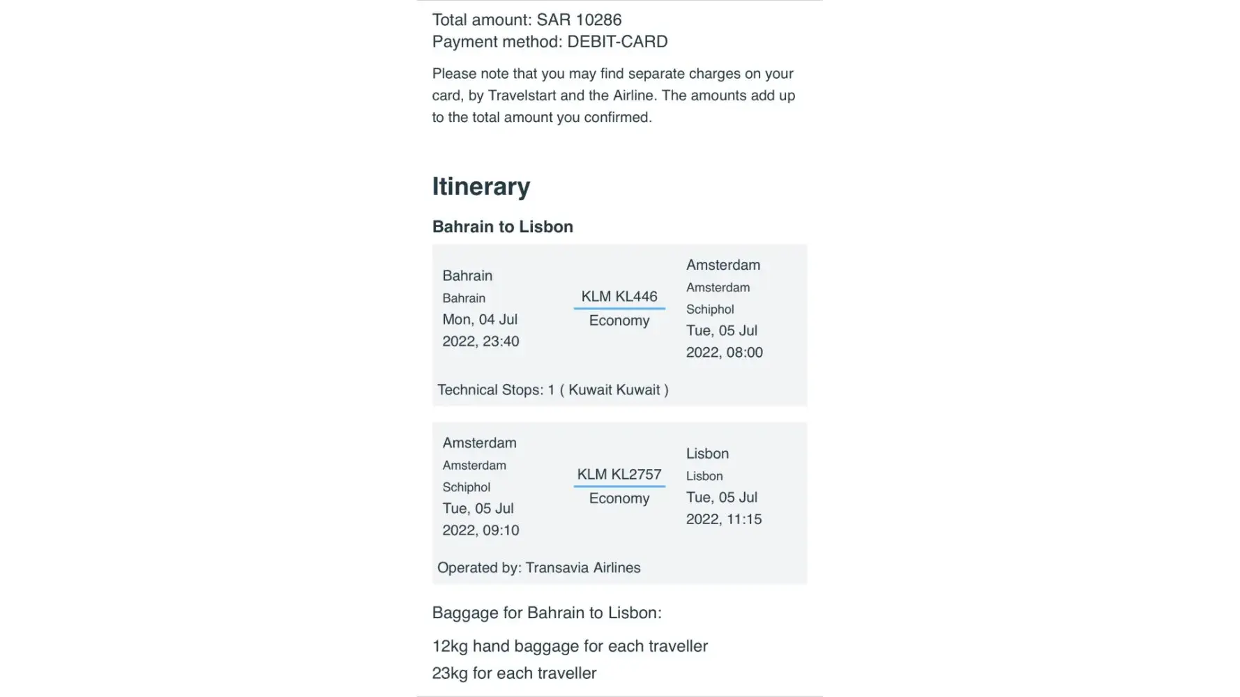 I booked through Travelstart and paid fully for two tickets from Amsterdam to Lisbon on flight KLM KL2757 on July 5, 2022. At the airport we were informed that we do not have E-tickets. We reached to Travelstart through phone, website and wahtsup with no help at all. We ended up paying from our pocket. When we reached out to Travelstart for over two months, we only received promise to resolve the issue and until today no response and no refund.