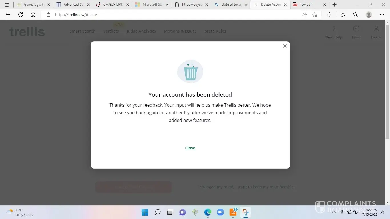 I started a 14 day trial subscription to Trellis Legal Research on July 4, 2022. In setting up the trial period I provided a credit card for payment IF I kept the service beyond the 14 day trial.