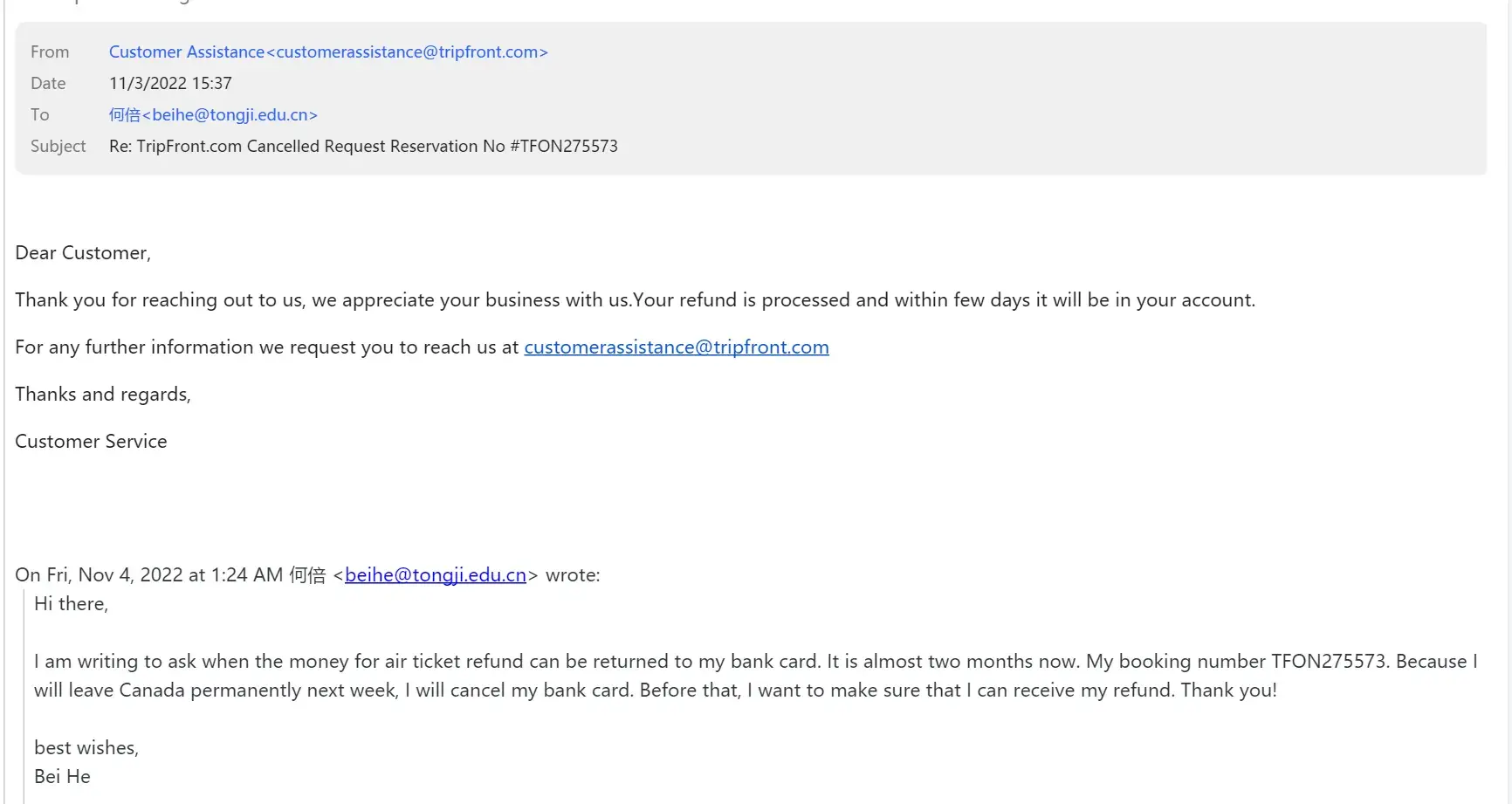 To remind addressees, I bought an airline ticket from Tripfront (Booking Reference No: TFON406168 Date Booked: Sep 14, 2022, 17:18 PST). On Nov 7 2022, I received an email from Tripfront that cancelled the booking and stated that “We have submitted a refund request in the amount of $571.67 USD to be refunded back to your original form of payment“ and “the amount is already refunded in the original form of payment and you should have the funds in a maximum of 6 to 8 weeks from now.“