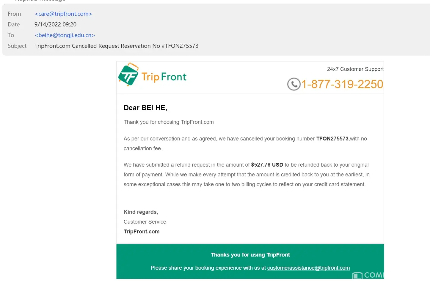 On February 4th 2023 I received the following from customerassistance@tripfront.com