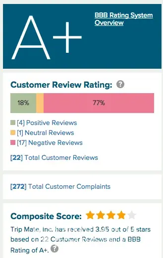 We are going through the same thing with TripMate that 77% of the reviewers on BBB website are experiencing. We filed what we thought was a straightforward claim for a trip we were unable to take due to my husband's illness. Each time we call we are told to call back in a couple of weeks. Each time we call back we have to leave a number due to high call volume. Sometimes we get a call back and sometimes we have to call again. HORRIBLE follow-through, HORRIBLE website, HORRIBLE customer service. My husband and I both who both have graduate degrees and an attorney looked at our claim for accuracy before submitting it. MD is one of the top notch in his field. They still need more info. We asked for a copy of the physician's statement. We were told it would take 10-14 days to get us a copy. We were unable to speak to a supervisor (none available). Their only purpose is to NOT PAY what is rightfully due to us. We are convinced we will not get our money back but we are committed to letting EVERYONE know what a HORRIBLE company this is. We will pursue legal action if necessary. In the process of filing a complaint to the BBB, Consumer Protection Division, the Texas Department of Insurance and the tour company. We are also notifying the tour group that we will NEVER travel with them as long as this is the only insurance available in the tour package. What a nightmare piled onto an already difficult situation (husband's illness)! We are out approximately $8, 000! I do not understand how a company like this gets a BBB A+ rating with 77% negative reviews. See pic.