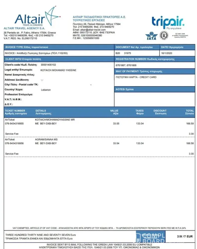 Payment total was 339.77 euros paid by credit card