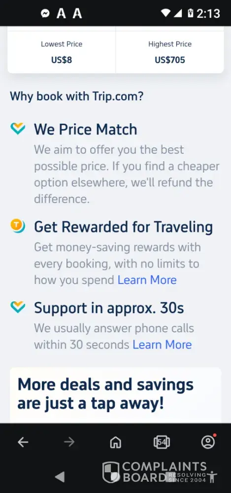 - While Trip.com has a high level of trust, our investigation has revealed that the company's complaint resolution process is inadequate and ineffective. As a result, only 5% of 56 complaints are resolved. The support team may have poor customer service skills, lack of training, or not be well-equipped to handle customer complaints.