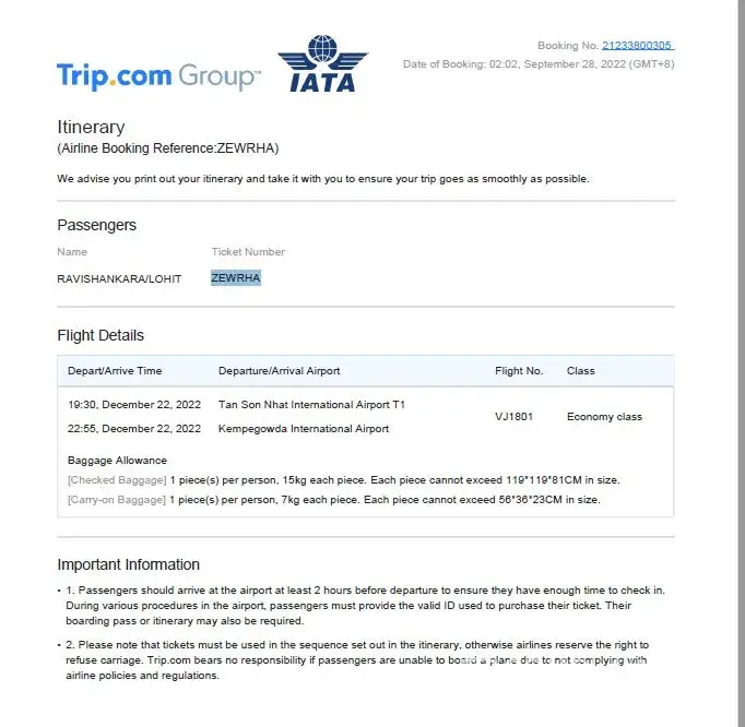 I had booked a ticket from Ho Chi Minh City to Bangalore on 28 September 2022.