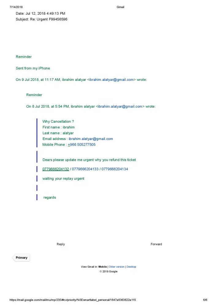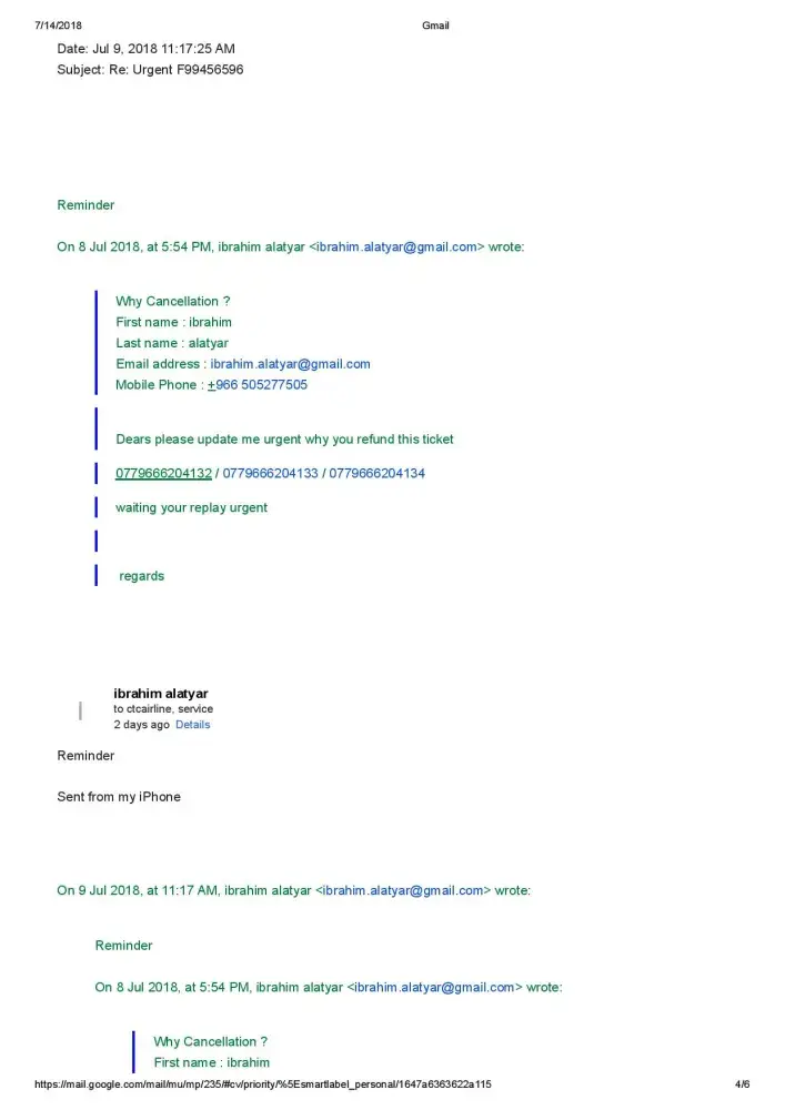I kept calling all the contact numbers I managed to find in the internet as well as sending many emails requesting the refund of my ticket but NO RESPONSE from your end.