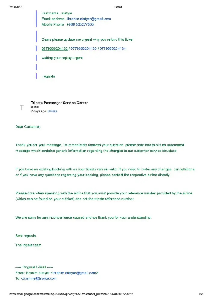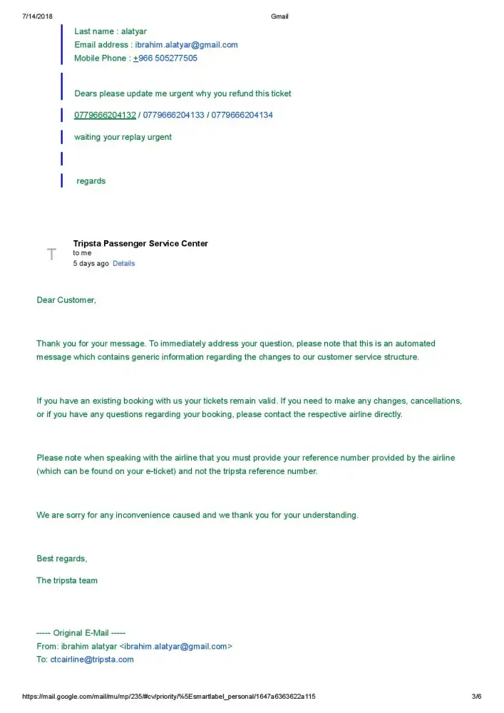 Tripsta is operating fraudulently and should be prosecuted for ripping of travellers with the absence of any customer support, their phoney website and a complete absence of anyway of contacting them post booking (phoney contact numbers, automated responses to emails telling you to go talk to the airline directly and the airlines telling you you have to talk to the agent...). unbelievable that a company can operate in this way.