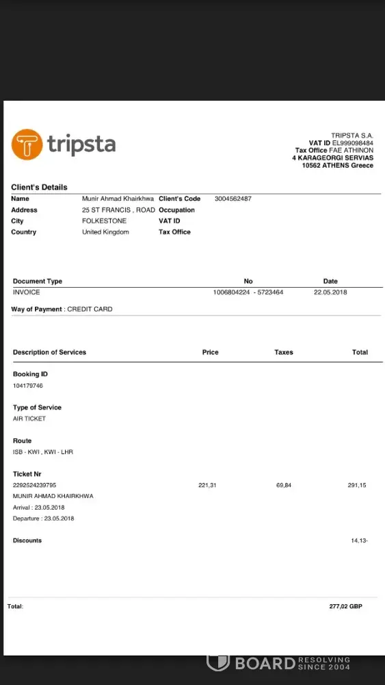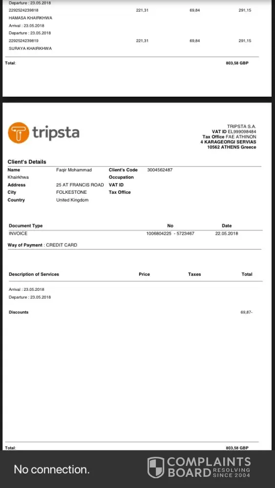 TRIPSTA S.A VAT ID EL999098484 Tax Office FAE ATHINON 4 KARAGEORGI SERVIAS 10562 ATHENS Greece