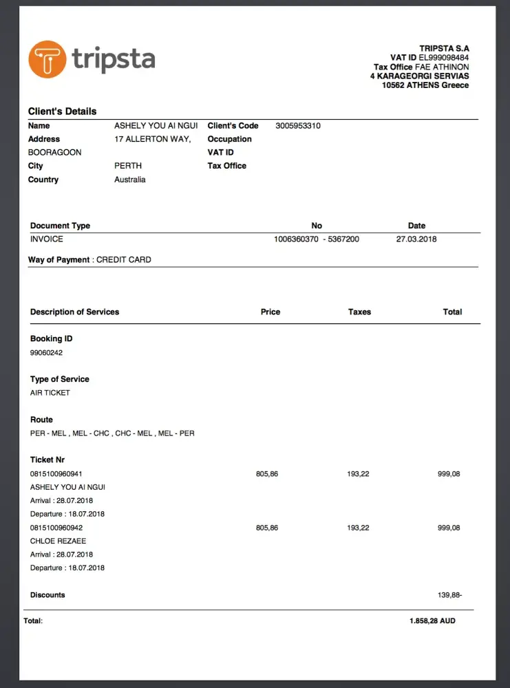 However, we are due to fly soon and I tried contacting QANTAS but to no avail. They said I had to contact tripsta directly but I have failed to do so through emails and calls to all the numbers provided on the internet. They have claimed to be 24h operating on calls but they all either disconnect or says the number is no longer in use. Attached below is a copy of the receipt of payment also noting the itinerary of the flights