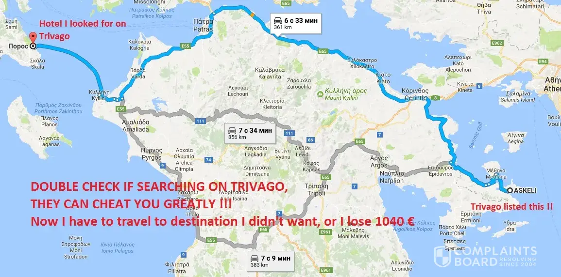 Yesterday, exactly 3 days prior my journey of 1200km by car, a hotel owner gives me a phone call to agree on time of arrival, and we both realize that the hotel that has been booked is not at Kefalonia at all. It is in fact on the opposite part of Greece, on the island of Poros, 7 hours ( 400km ) away from my wanted destination. I cannot cancel my booking, or I would have to pay full amount ( 1040€ ), so I have to travel now to a NON-WANTED destination, I have additional cost of booking another sleep over room along the route, as my voyage is now 14, 5 hours drive instead of 10. I have to rearrange my travel times, as I have to start the journey one day in advance. What a waste of money and time, thanks to TRIVAGO. This is a very negative first experience with Trivago.