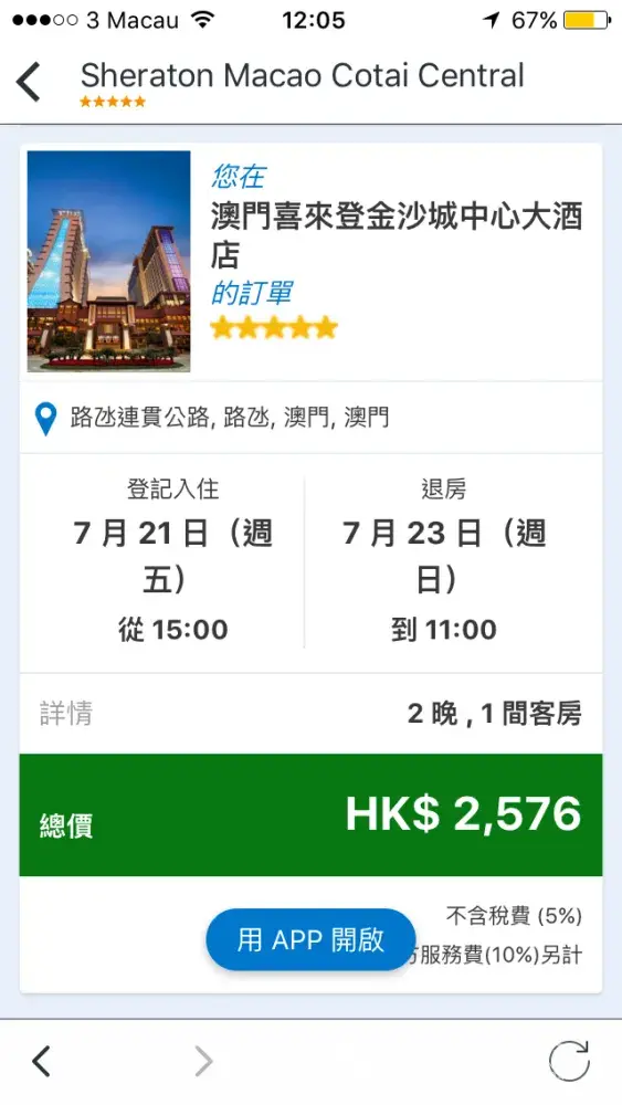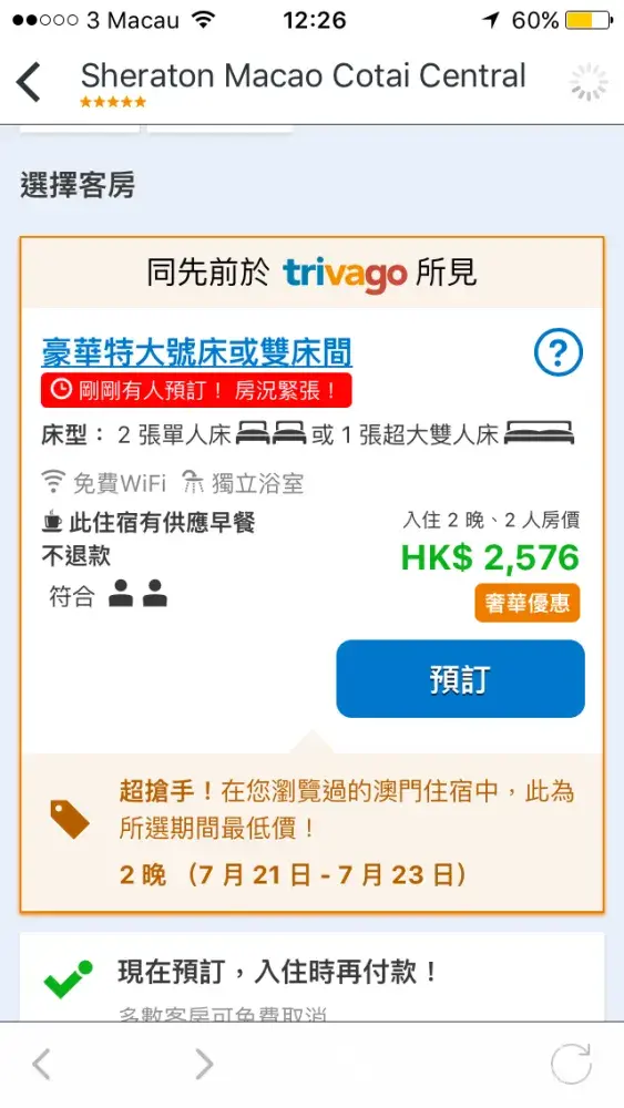 On 2nd July, I booked Macau Sheraton Hotel through Trivago. When I searched the Macau hotel for 21st July to 23nd July. Trivago automatically link to booking.com showing the "best price" of $2576 (excluding 5% tax and 10% service charge) for two nights. I booked the "best price" hotel room. However, after I confirmed all the payment, I checked again immediately through Trivago. And the app showed Wing on travel price $2588 (including all tax and service charge) for same room type for two nights.