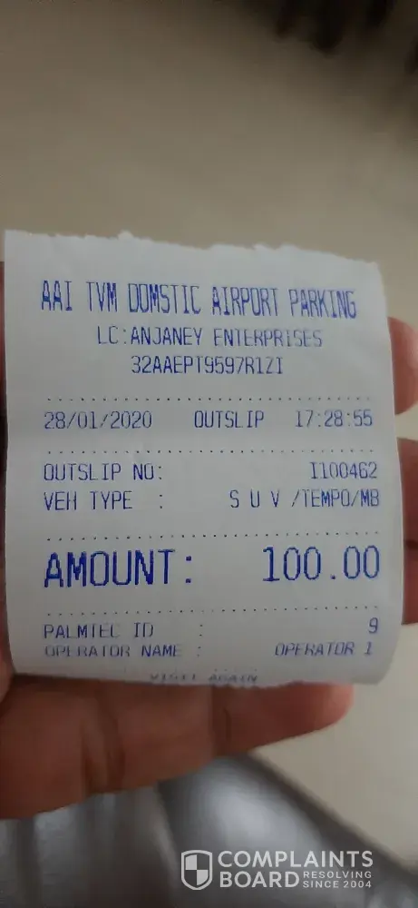 I had parked by Suzuki Ciaz for 20 minutes in Trivandrum airport parking. I Should have been charged 85 for parking as it was below 2 hours, but I was charged 100 and received a bill which is the fee for SUV or Tempo. I had asked about this to the person in the counter. The price board clearly says 85 for cars if time is below two hours. Please advice.