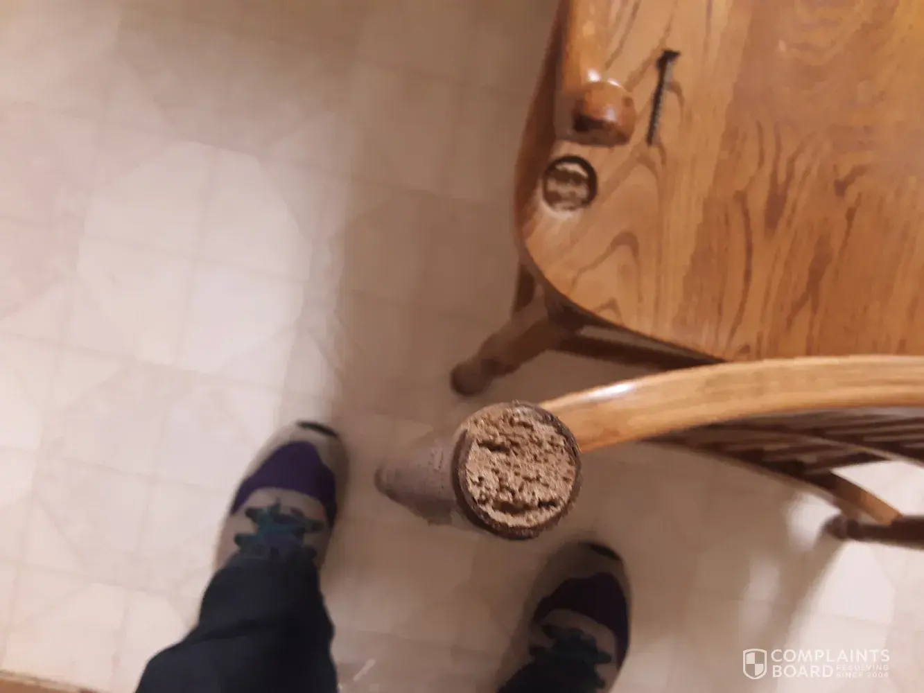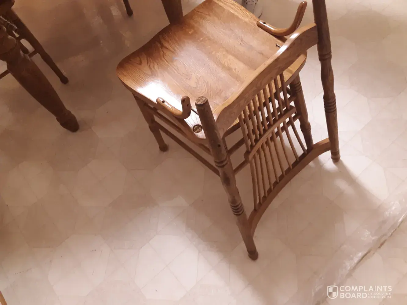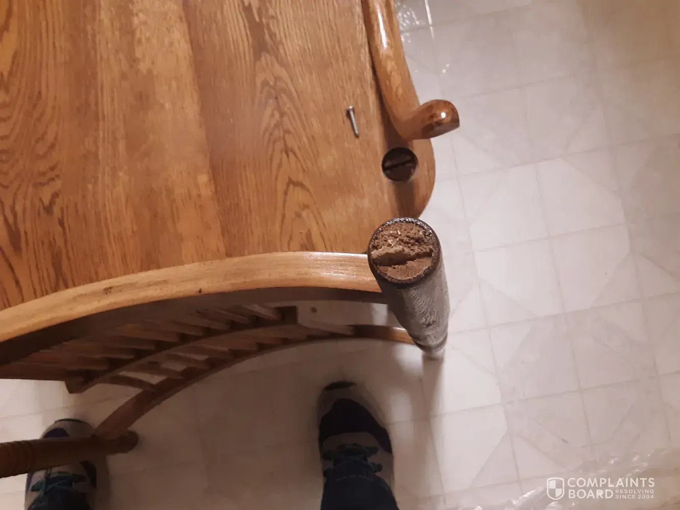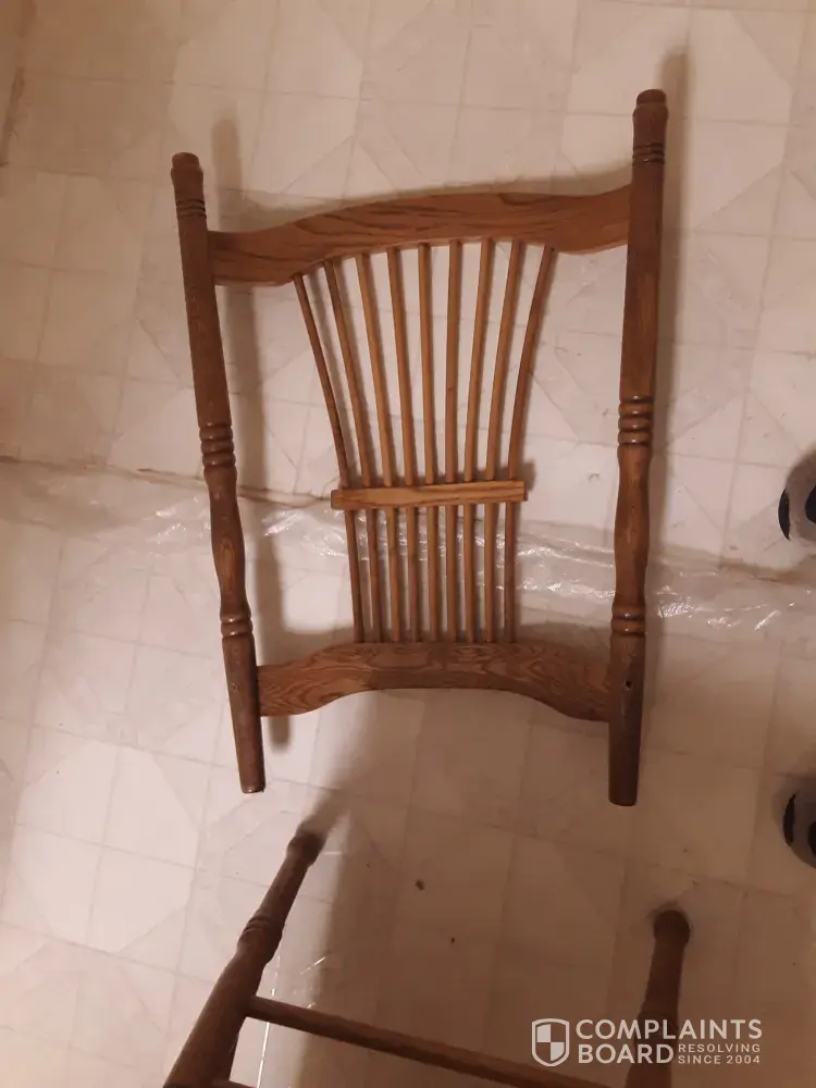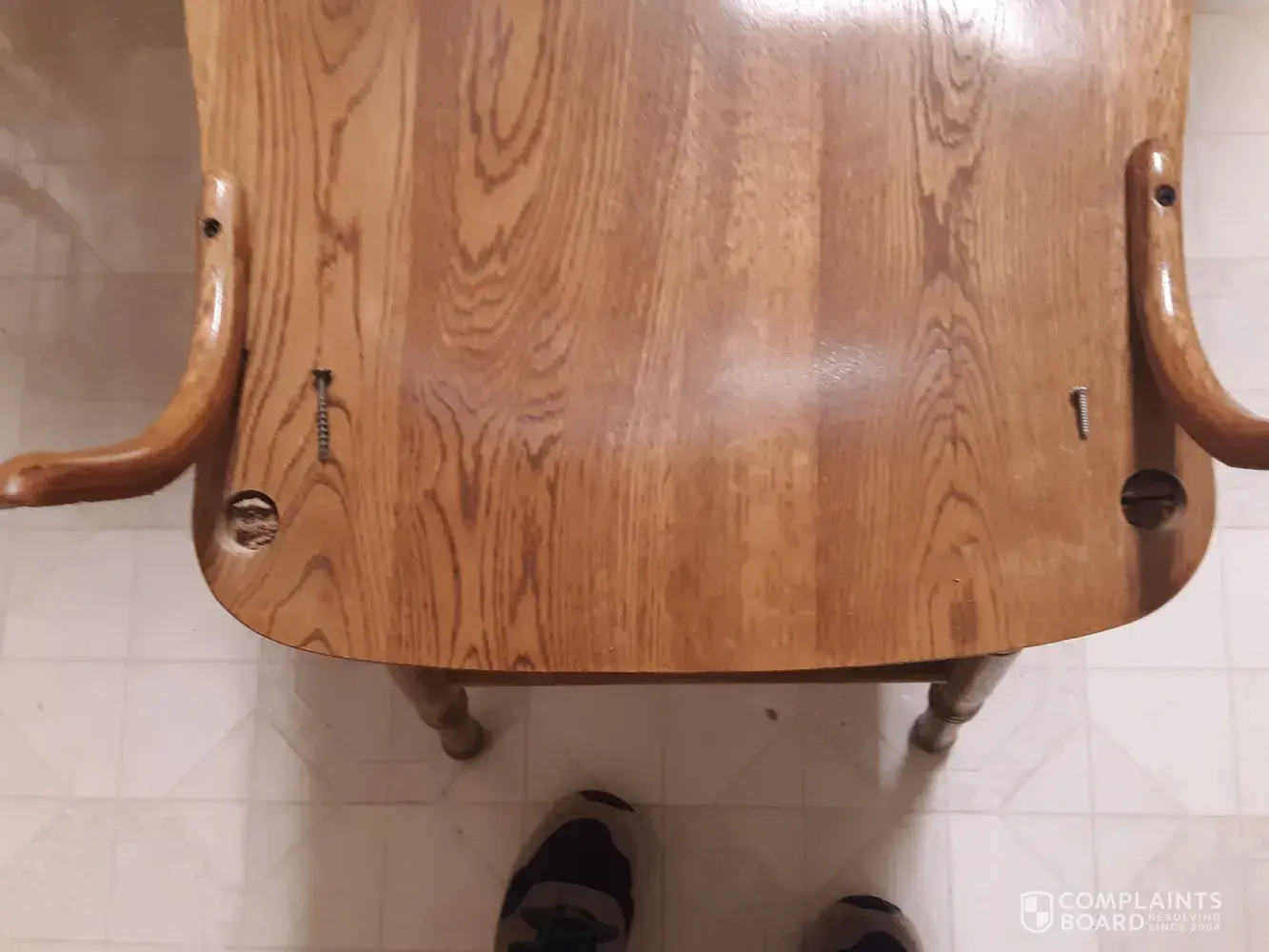 My 85 year old mother spent alot of money on a table and kitchen chairs from Trivett store on Fredericksburg Va. I was just visiting, I am 150 lbs just leaned back gently in chair, the back snapped off. Upon inspection there were two different size screws holding the back of chair, one screw way smaller than the other screws holding the remaining chairs together! This must have happened in manufacturing process.In addition, the posts going into the seat of chair seem to have crumbled apart because the whole thing came apart as you can see in attached picture! If my 85 year mother had been sitting here she could have hit the floor and broken a hip!