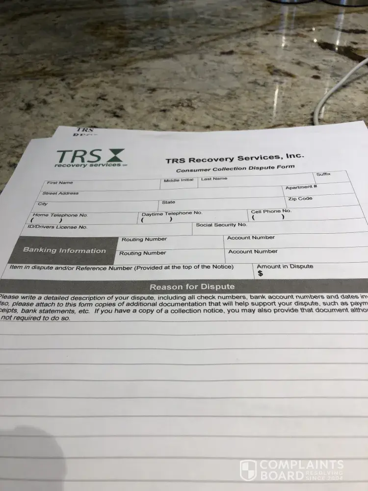 Sent me 3 letters of Unpaid Electronic Transfers and one of an unpaid canceled check on an Account I never had. Although the check did have my name and DL # on it. The signature was clearly not mine. Tried to call them about it and it was all robot and deflection to a website to dispute. On the said website they wanted info that a true collection agency would have such as Full Name and SSN. Called local LEO to file fraud and Identity theft. Was told by the officer that TRS is a scam and they were only Phishing.
