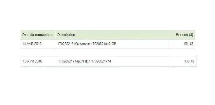 Lorsque je regarde mon état de compte je constate que le 5 avril 2016, un montant de 6.70$ et un autre de 5.34$ en dollars canadiens m'ont été facturés et c'est correct - j'ai bien autorisé ces achats là . Par contre, le 19 avril 2016 un montant de 149.76$ et le 21 avril 2016 un autre montant de 134.84$ m'ont été facturés pour les mêmes crèmes alors que je n'ai jamais autorisés ces montants- là et que je n'ai rien reçu d'autres que les échantillons mentionnés ci-haut.