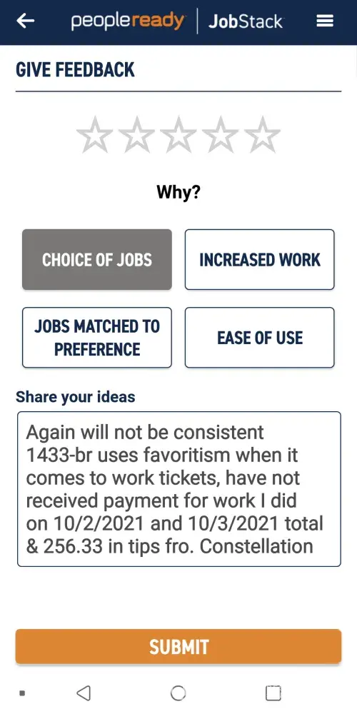 I use their app called Job Stack to accept work but then I get taken off the ticket. It has happened twice now. The first time was Sisco of San Francisco which was for $22 per hour starting Feb. 10th to now M-f and the second was at 6767 E Main St., in Stockton CA for a construction company for $33.80 per hour working today, 2/14/22 and 2/15/22. This needs to stop-whatever the reason. It's not fair to put a job out there and I accept the assignment and make plans and arrangements only to have it cancelled. If I agree to the ticket and you cancel it then pay me as if I showed up. Because I would have.