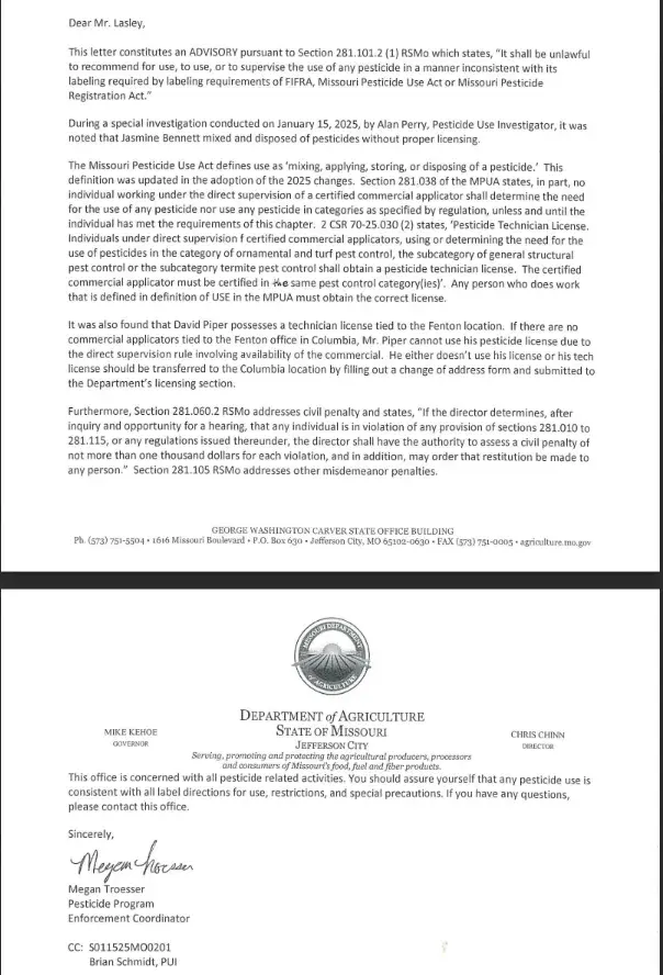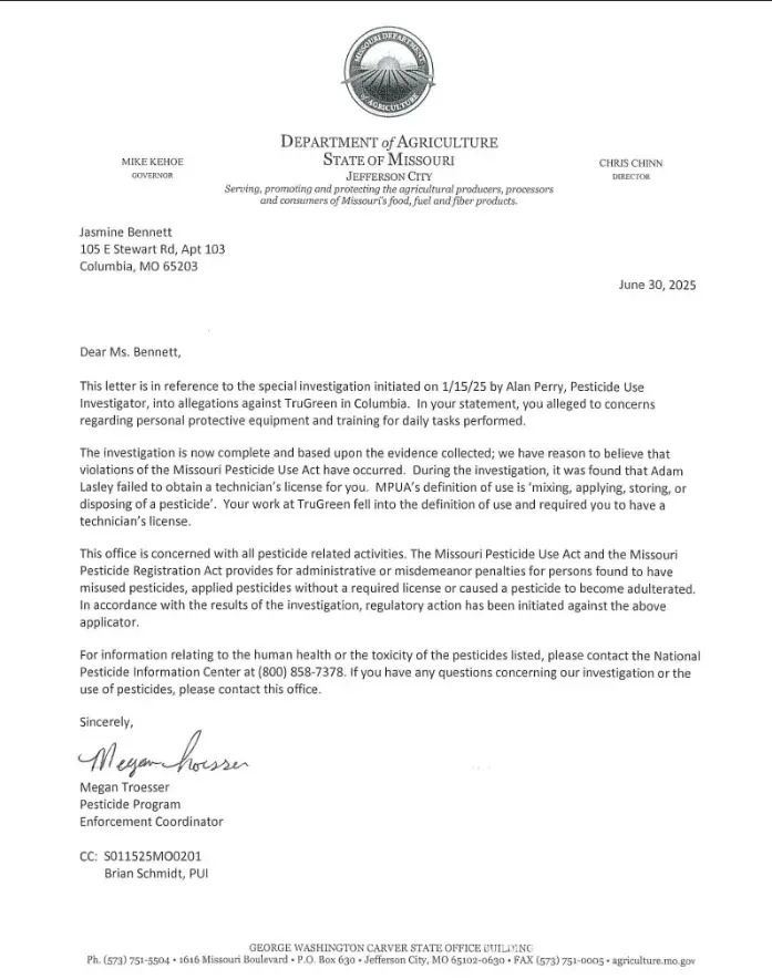 Manager Adam Lasley of TruGreen located in Columbia, MO knowingly allowed me to mix and use pesticides and other hazardous chemicals with no PPE or formal training. This is recognized by the Missouri Department of Agriculture. This negligence led to my documented illness. TruGreen, their private counsel and counsel for Gallagher Bassett, as well as staff...