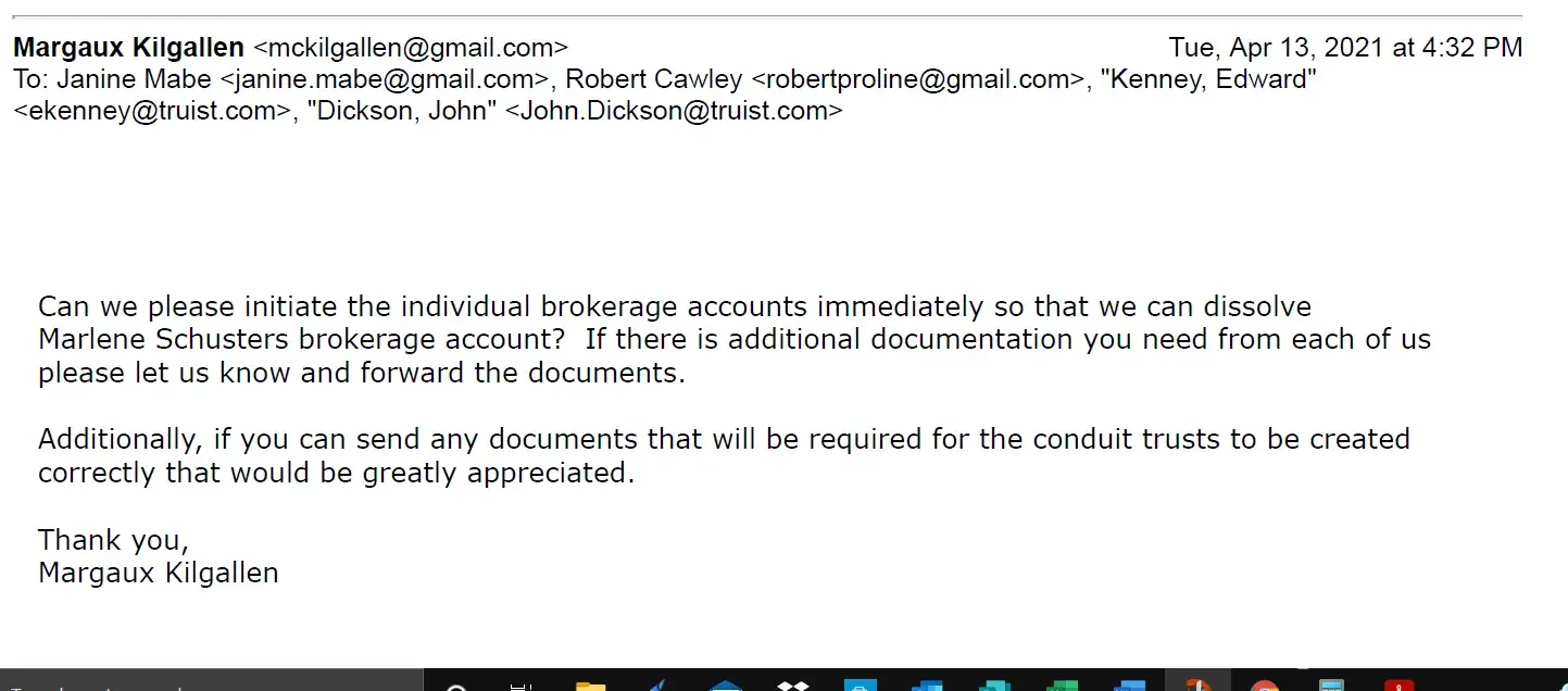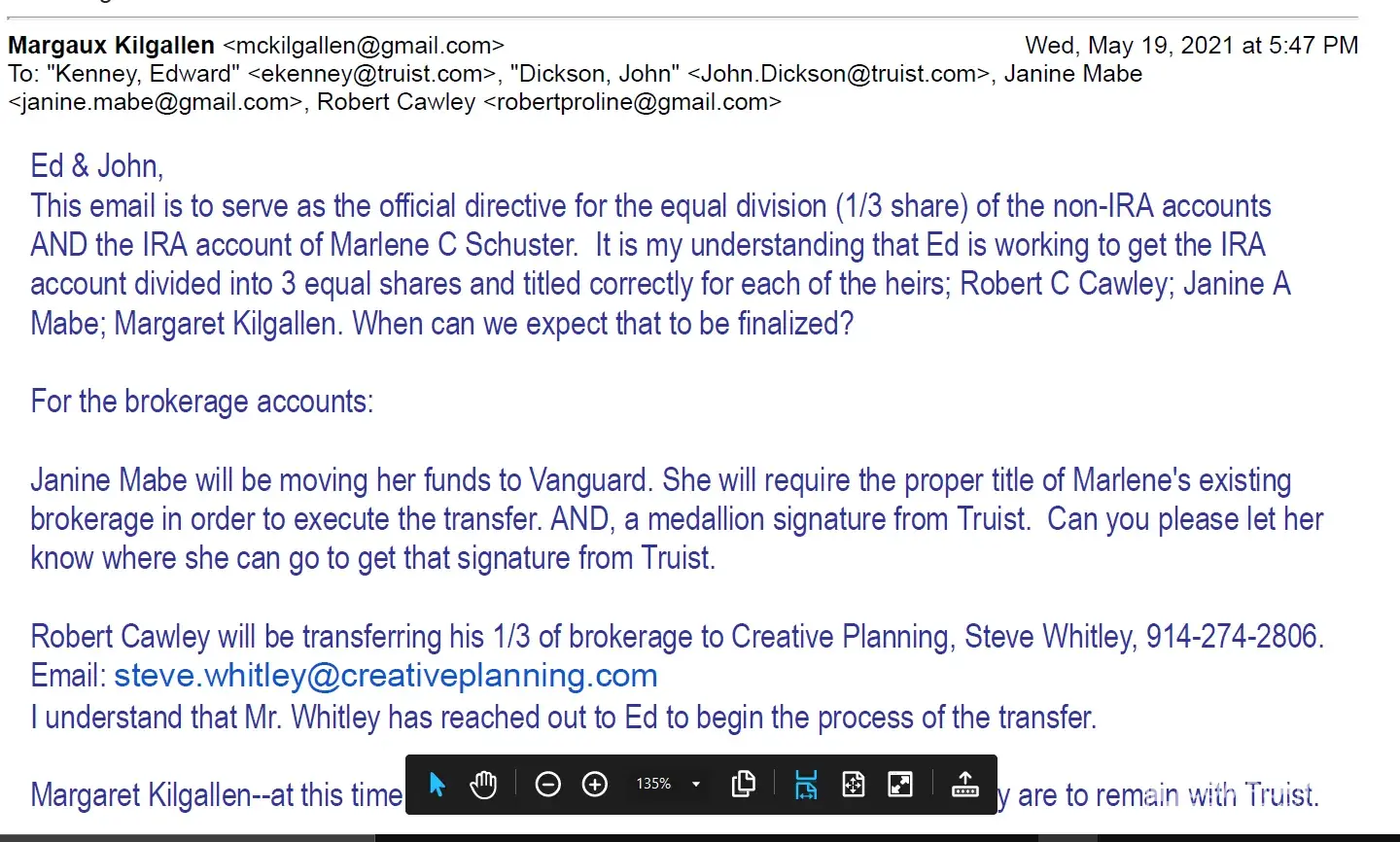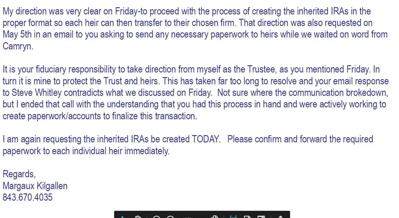 As this transfer has taken over 9 months to complete it has cost the heirs and the Trust $17, 910.00 in higher fees than those charged by the receiving investment firms, $10, 442 this quarter alone.
