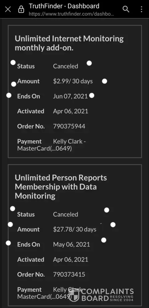 I went to the website www.TRUTHFINDER.COM and signed up for their services. I got the result and cancelled my subscription. However, the owner of the website charged me before subscription and continued to take money after I cancelled it. I was very upset that I believed to their advertisement, because it was waste of money and I could get such results from some free websites. I really need help, because I don’t want to waste more money now.