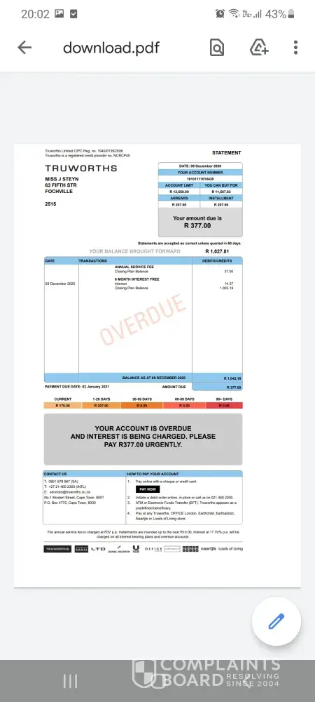 Please find attached proof of payment for december and my statement from truworths. How can my account be overdue if I paid even more than I was supposed to?Â