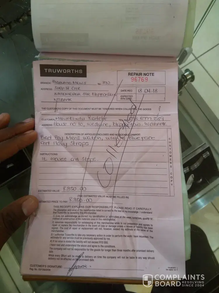 Now my query is this, Seven months ago I bought a watch at a Truworths with a promising warranty. It broke within a month and they took it in for repair. It broke three more time with the same problem. I have never enjoyed the watch for more than 2 weeks. I always waited six weeks minimum.