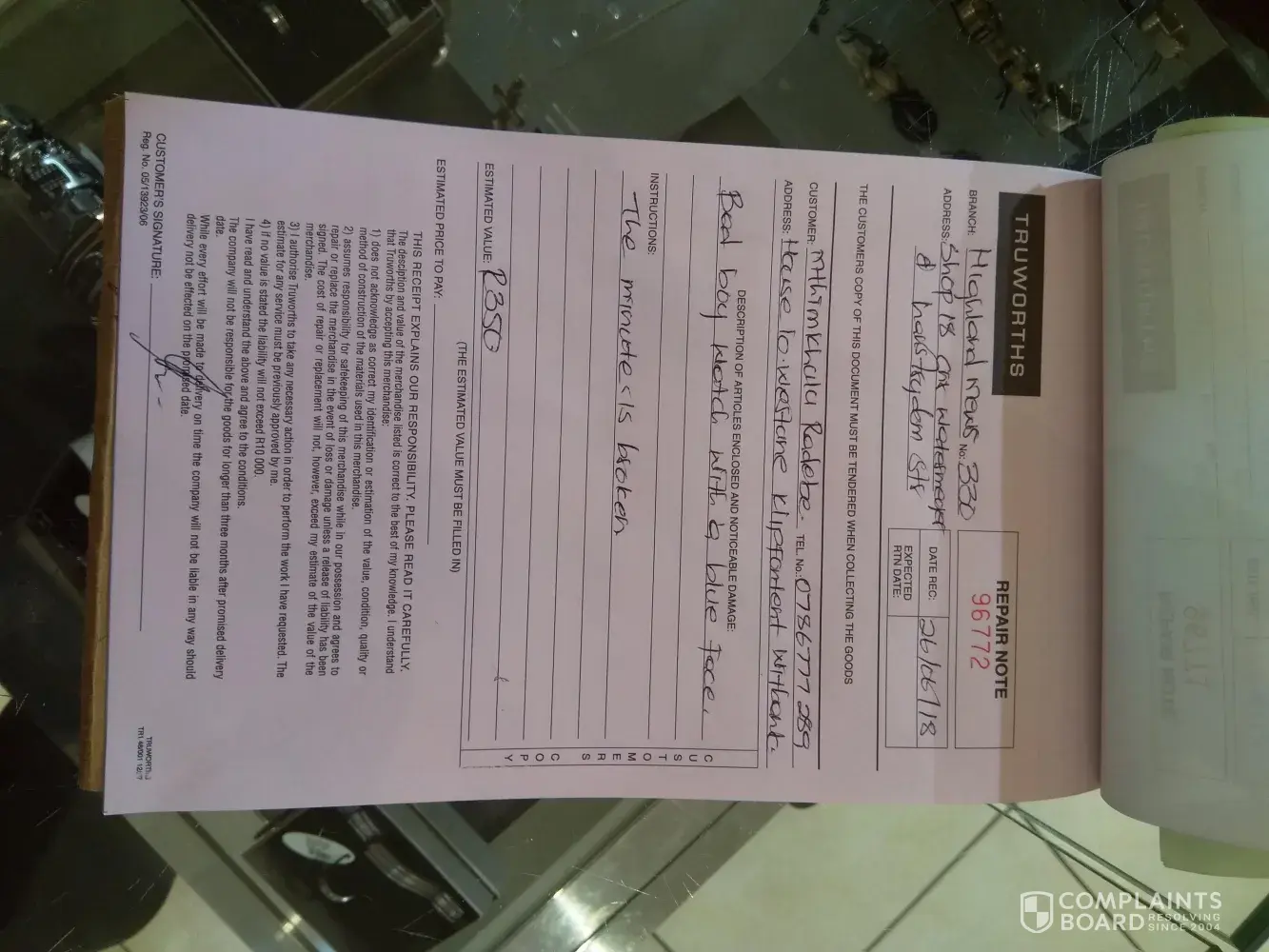 Truworths Store Manager denied me a replacement and also denied me launching a complaint with the store telephone. We understand products fail, but not so many times. Truworths failed to take responsibility of their worthless warranty. The Store Manager at Witbank Klipforntein Emalahleni Truworths didn't want to intervene. The Store Manager didn't care and had no conviction of my disappointment. As a customer I cannot come repetitively for repair of one product which broke the same way and the store fails to protect my interests. The watch broke in less than 24hours and they didn't care about my needs for the watch, instead they took in the watch for other repair which means I must wait another 6 weeks. At this point I just want my money back.