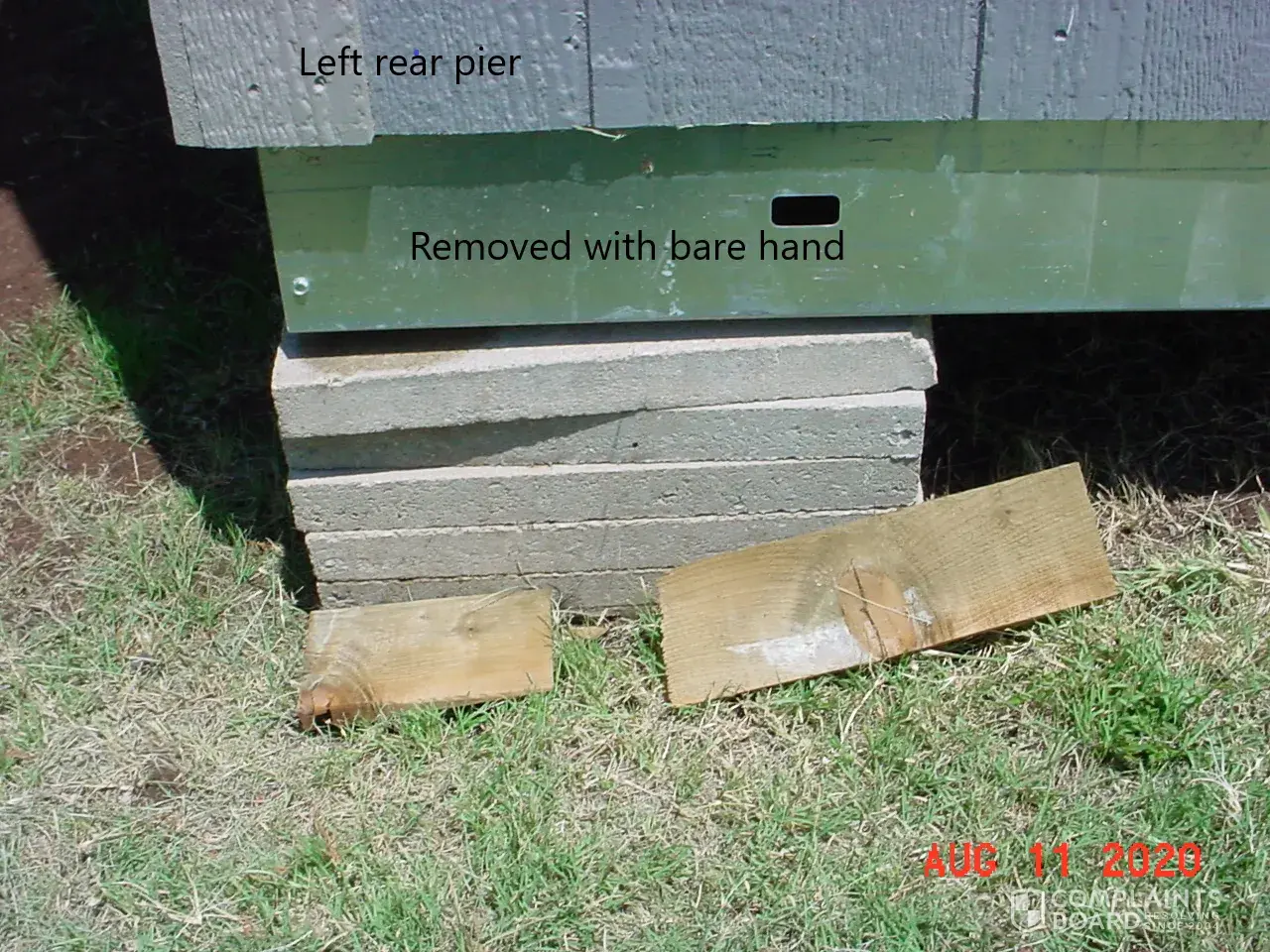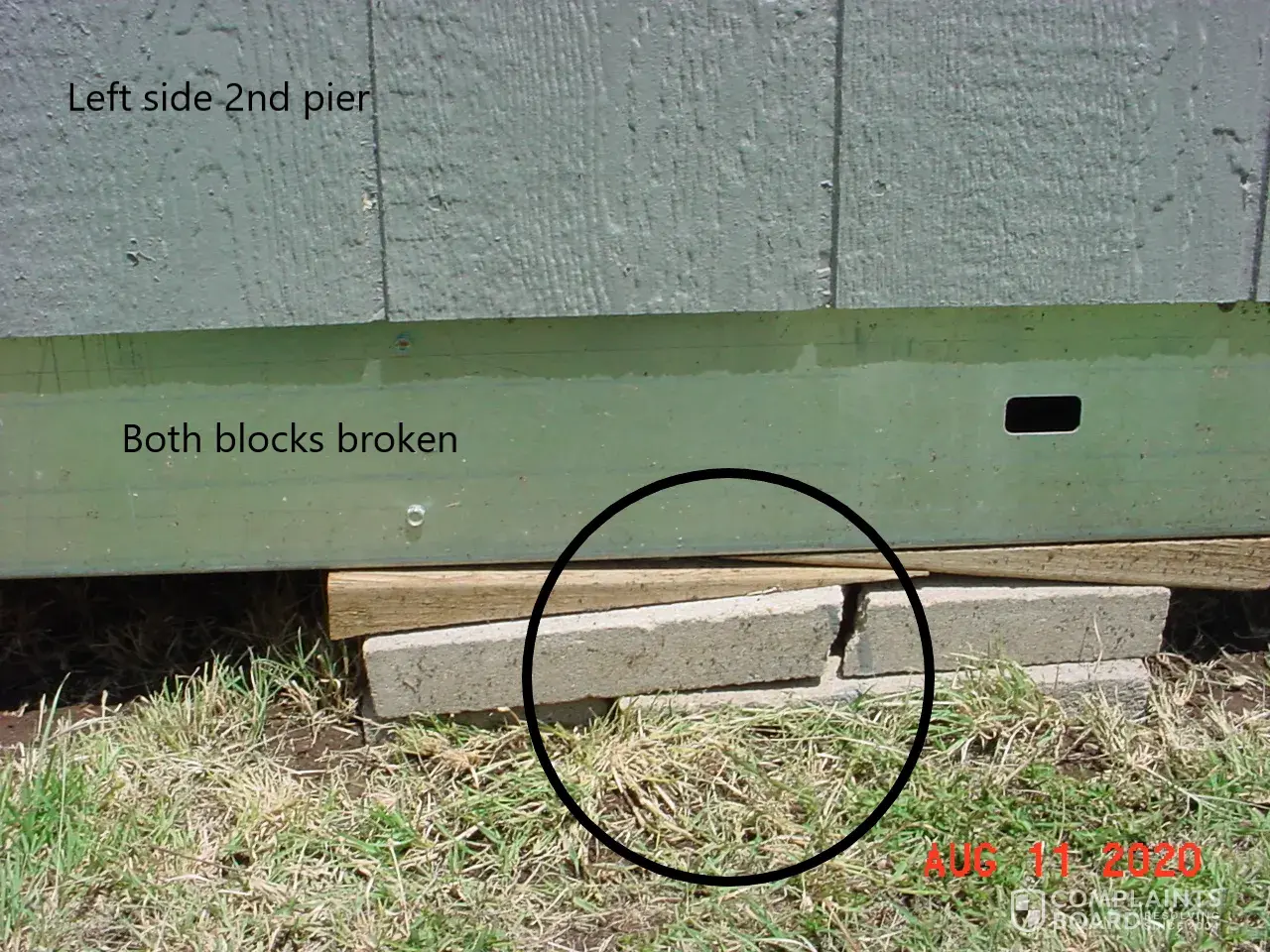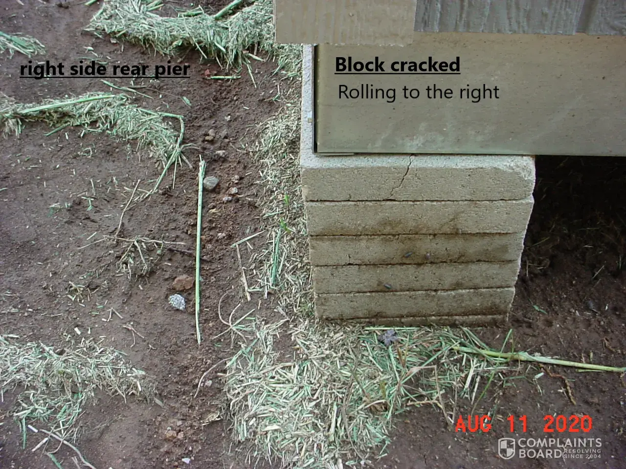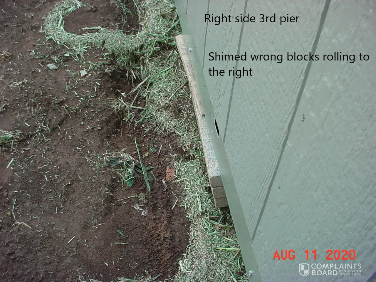 Concrete pad stacks are rolling to the right, some of the blocks are broken, some are not supporting the building, the entire building appears to be shifting to the right. shims have not been installed properly, shims are coming loose, some are not supporting the building at all, the door drip edge is pulling away from wall, the belly trim above door is pulling away from wall. All support pads were installed inline with outside of rim joists but either they have moved or the building has.