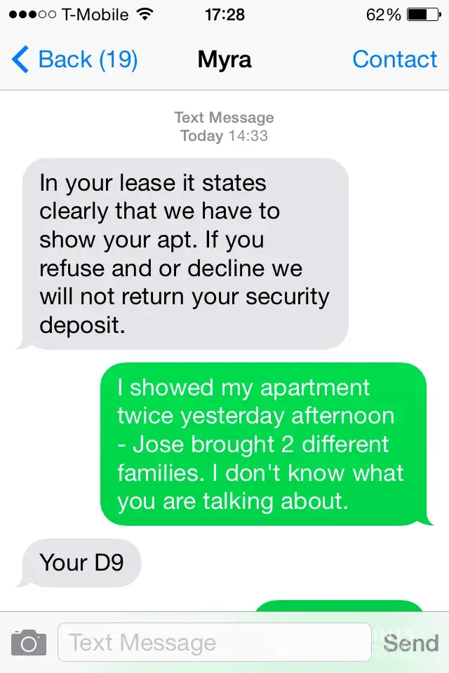 I have Received a threatening message & call from Myra of Tuli Realty. (Picture attached). She is accusing me for not cooperating and that Tuli Realty will not refund my security deposit. This is completely untrue - Jose showed the apartment twice yesterday. She says she called me and I didn't pick up. The truth is that I was out of network and my phone never rang. I was in the subway travelling. She showed up without confirming with me whereas I clearly told her that she should ask me if I am available 30mins - 1 hour prior to coming - as I cannot block my schedule and tell in advance 1 day before.