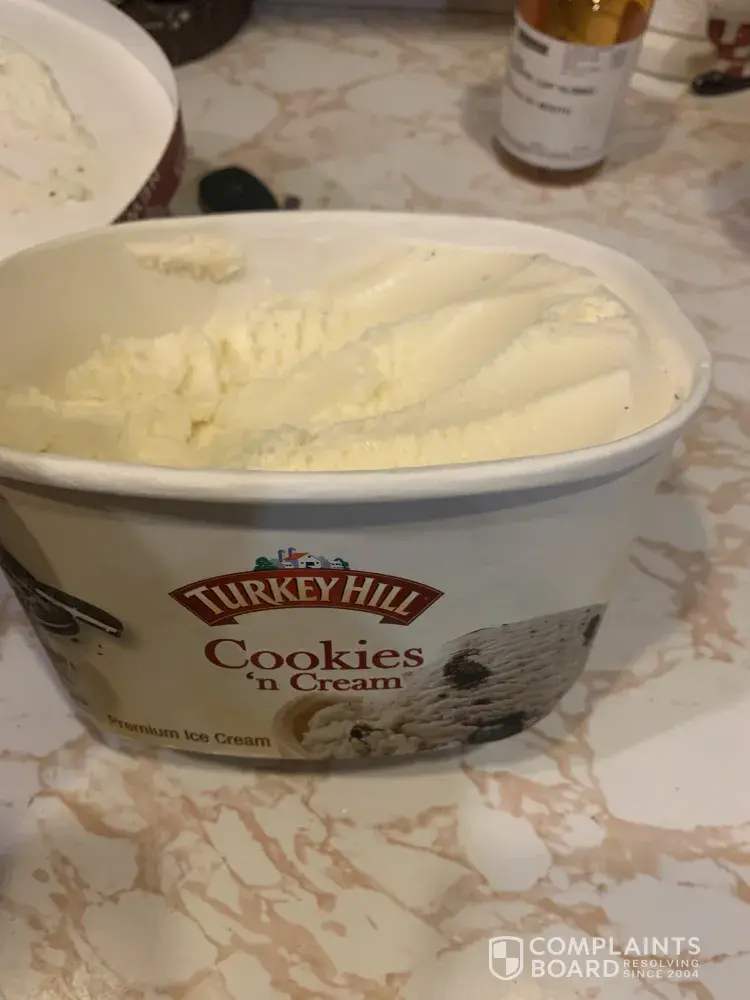 I purchased a half gallon of ice cream yesterday and when we started dishing out our portions, it turns out there is no cookies in this batch. It appears to pretty much be vanilla ice cream. We have never had this issue in the past when purchasing Turkey Hill products. We also purchas many gallons of your diet iced tea on a weekly basis and have no complaints. Just dissatisfied with the ice cream we had bought.
