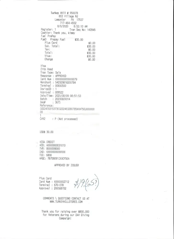 On friday sept 27th I went in with a coworker to my local turkey hill to get a half gallon of whole milk, a bag of shredded cheese, and the 2/$2 tornado's. My bill should of been less than $10, I was not given a receipt and rushed out of the store. The next day when I checked my account I was charged $31.13. This would have cost me $100+ in overdraft and...