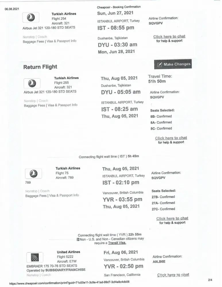 How come there was no problem on our initial flight - same route from usa to dushanbe and on the 5 of august, 2021 the turkish airlines claims that they don't see it on the system the half of the ticket and itinerary (from dushanbe to istanbul to vancouver). Looks like the problem occurred with in turkish airline system. Turkish airline representatives in dushanbe blaming cheapoair. We contacted cheapoair and even checked our booking reservation and itinerary on chatbot of cheapoair and there is no problem. We may not take this matter to court if you fix this problem and issue us new tickets and reimburse all the expenses caused us by this problem of turkish airlines system.