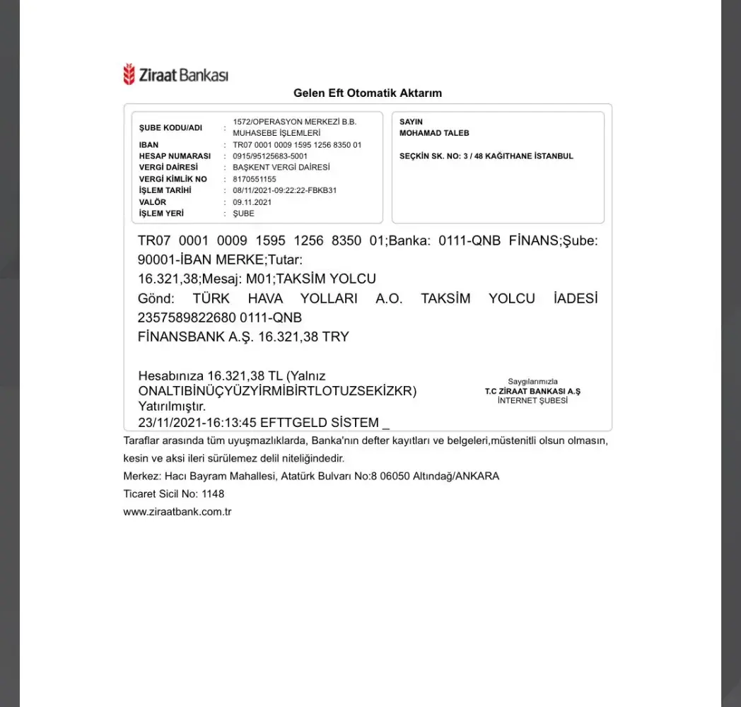 I got a refund from Turkish Airlines for an Unused tickets (Mohamad Taleb $1030.22 + Sarah Taleb $1030.22 = $2060.44). Simply the airline decided to refund me in Turkish Lira rather than in USD as paid with my Citibank credit card. I received 16, 321.38 Turkish Lira on November 9th 2021 which makes the amount equal to $1685 (a total difference of $375 missing). I called the Turkish Airlines feedback department and they put me into a complicated online process that got me generic replies with no solution or refund of the remaining balance.