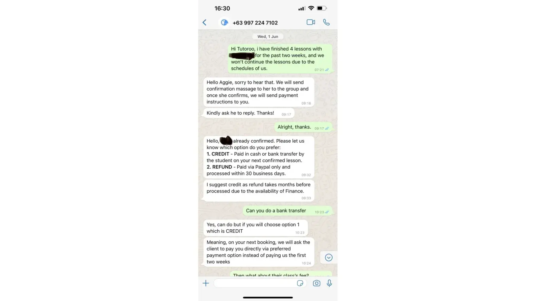 I am very surprised, because I totally did not expect this! I asked for a bank transaction, Tutoroo told me better to choose Option*1 which is credit, I said I want a refund, Tutoroo said it's not suggested because it takes a long time, then Tutoroo said they have a tutor that she will pay some money directly to me this time, and the rest of the money they will find another way to pay me.